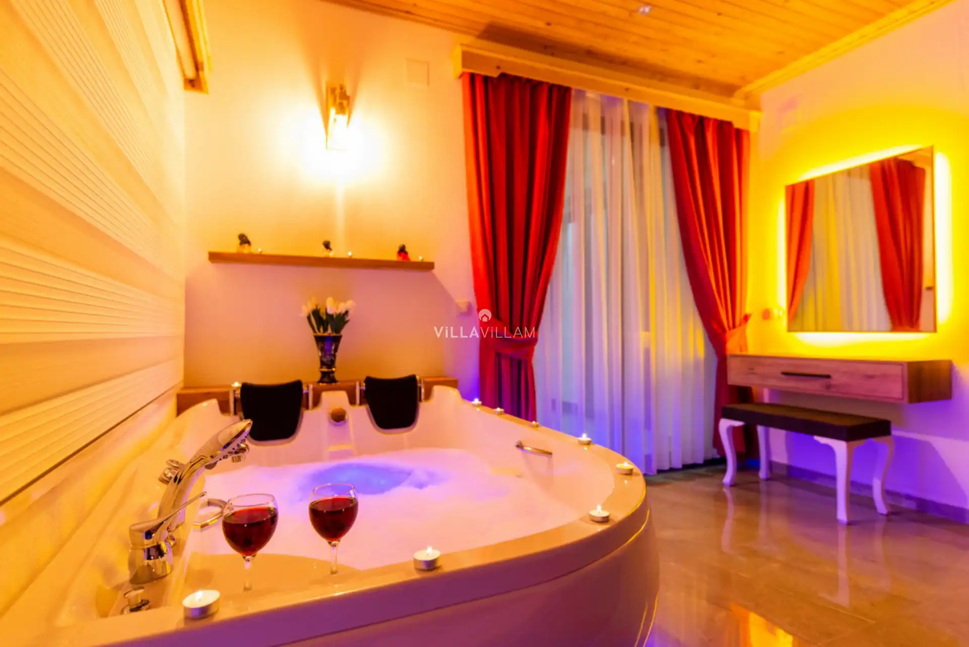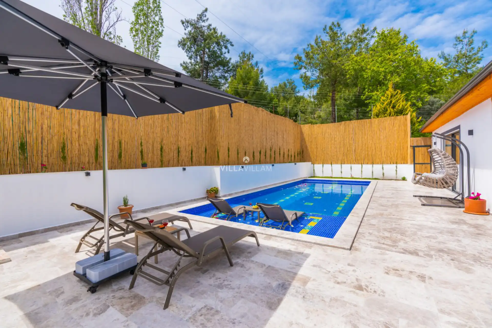 Doğa ile iç içe, sevdiklerinizle birlikte güvenli ve huzurlu bir tatilin keyfini sürebileceğiniz villanın havuz terasında şezlong takımı, oturma grubu, salıncak ve barbekü alanı bulunmaktadır. Yine havuz terasına açılan konforlu oturma odası ve donanımlı açık mutfağı; bir yatak odasında çift kişilik yatak, ebeveyn banyosu ve jakuzi, ikinci yatak odasında ise iki tek kişilik yatak ve banyo bulunmaktadır.