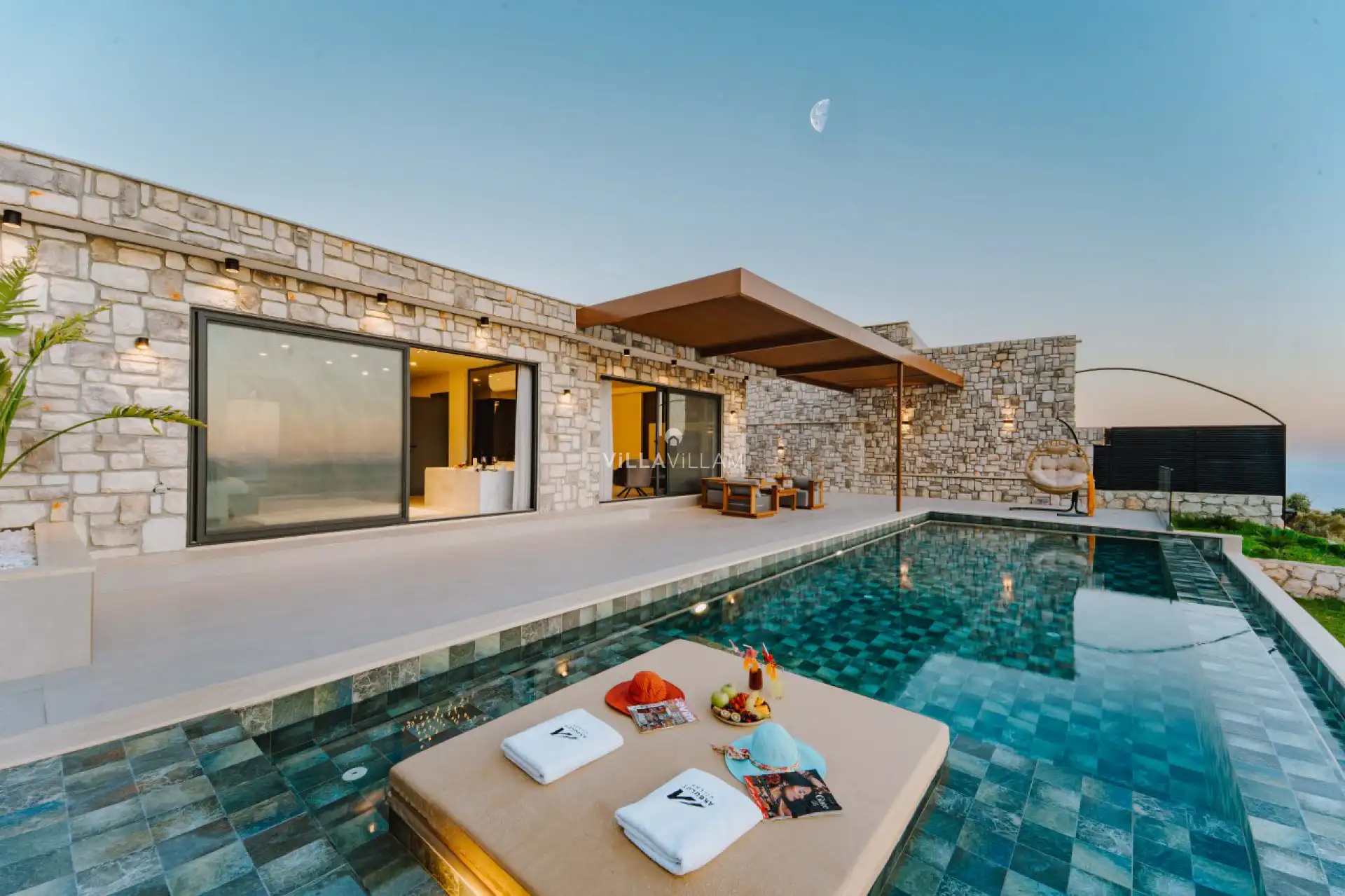 Geniş ve korunaklı yapıya sahip havuz terasında yer alan sonsuzluk havuzu, lüks ve konforu bir arada sunarken; oturma grupları, barbekü alanı ve şezlong takımı gün boyu güneşin tadını çıkarmanıza olanak tanımaktadır. İç mekânda, tüm mobilyaları konforlu olmasının yanı sıra modern bir anlayışla seçilmiş oturma odası, sauna, hamam, sinema odası ve tüm ihtiyaçlarınıza karşılık verecek açık mutfağı; birinci Yatak odasında bir çift kişilik yatak, Fransız küvet ve ebeveyn banyosu; ikinci yatak odasında bir çift kişilik yatak ve ebeveyn banyosu yer almaktadır.