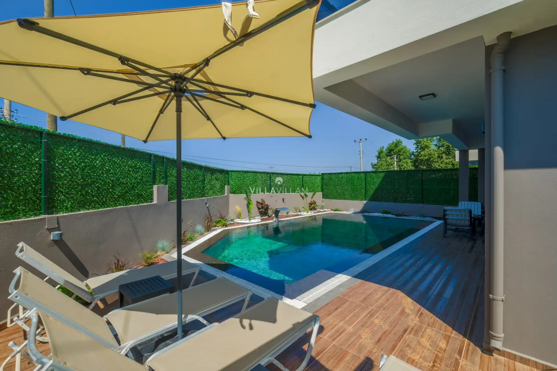 Geniş bir bahçeye sahip olan villamızda, kapasiteye uygun şezlong takımları ve oturma alanlarıyla keyifli vakit geçirebilirsiniz. Havuz terasına açılan donanımlı ve konforlu oturma odası ile mutfak, tatiliniz boyunca ihtiyaç duyacağınız her şey düşünülerek tasarlanmıştır.Villamızın iki yatak odasında çift kişilik yatak, ebeveyn banyosu ve jakuzi bulunmaktadır. Üçüncü yatak odasında da çift kişilik yatak ve ebeveyn banyosu yer alır. Dördüncü yatak odasında ise iki adet tek kişilik yatak mevcuttur.