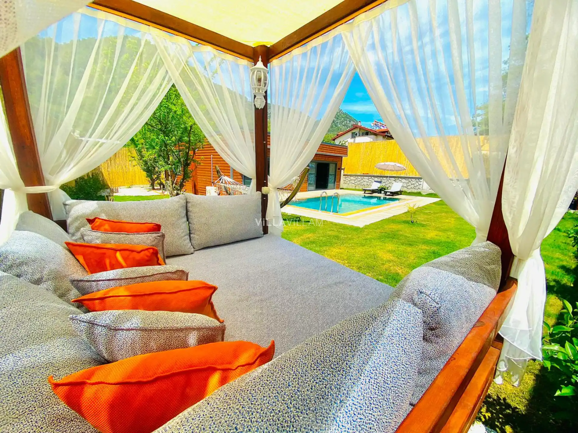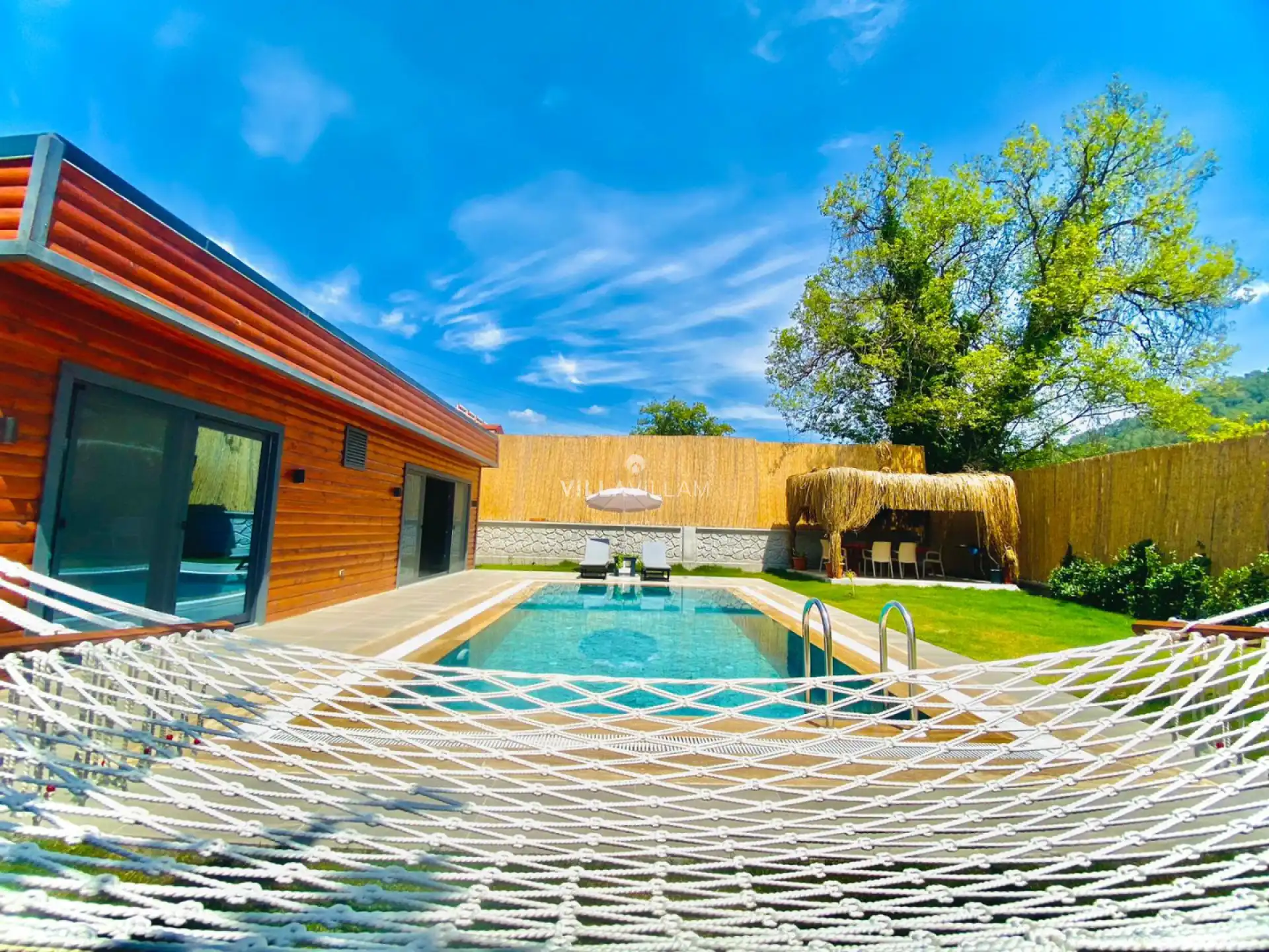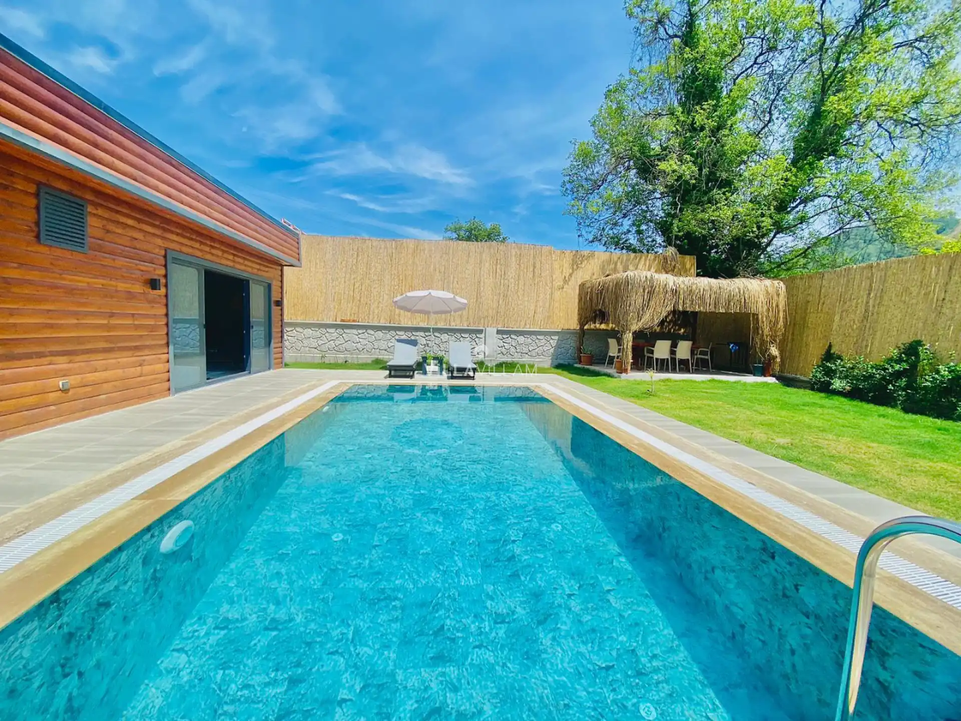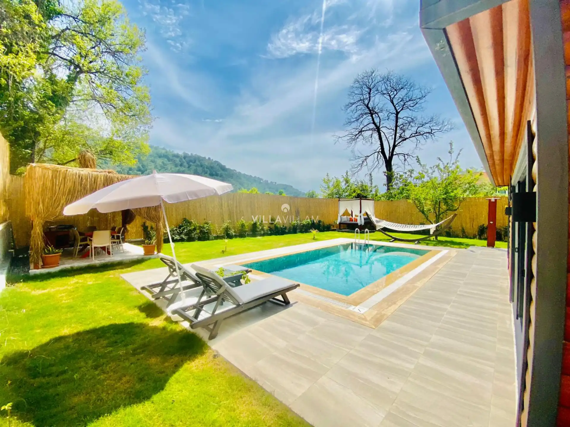 Korunaklı havuz terasında kapasiteye uygun şezlong takımı, oturma grubu, salıncak ve barbekü alanı bulunan villanın, yine havuz terasına açılan oturma odası ve donanımlı açık mutfağı; bir yatak odasında çift kişilik yatak ve ebeveyn banyosu; ikinci yatak odasında da iki tek kişilik yatak bulunmaktadır. Konforlu bir tatil için her detayın düşünüldüğü villada, ayrıcalıklı bir tatilin keyfini sürebileceksiniz.