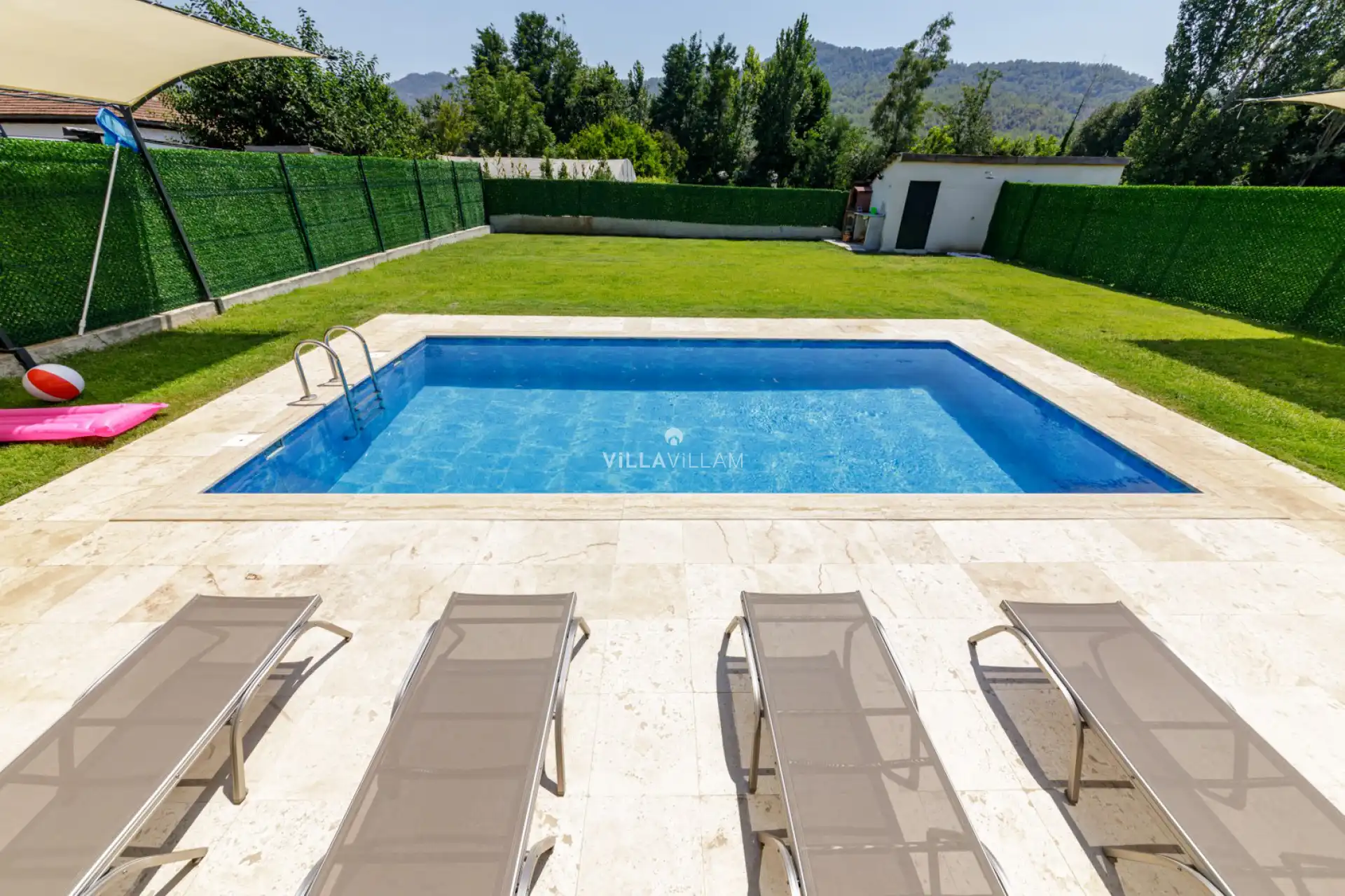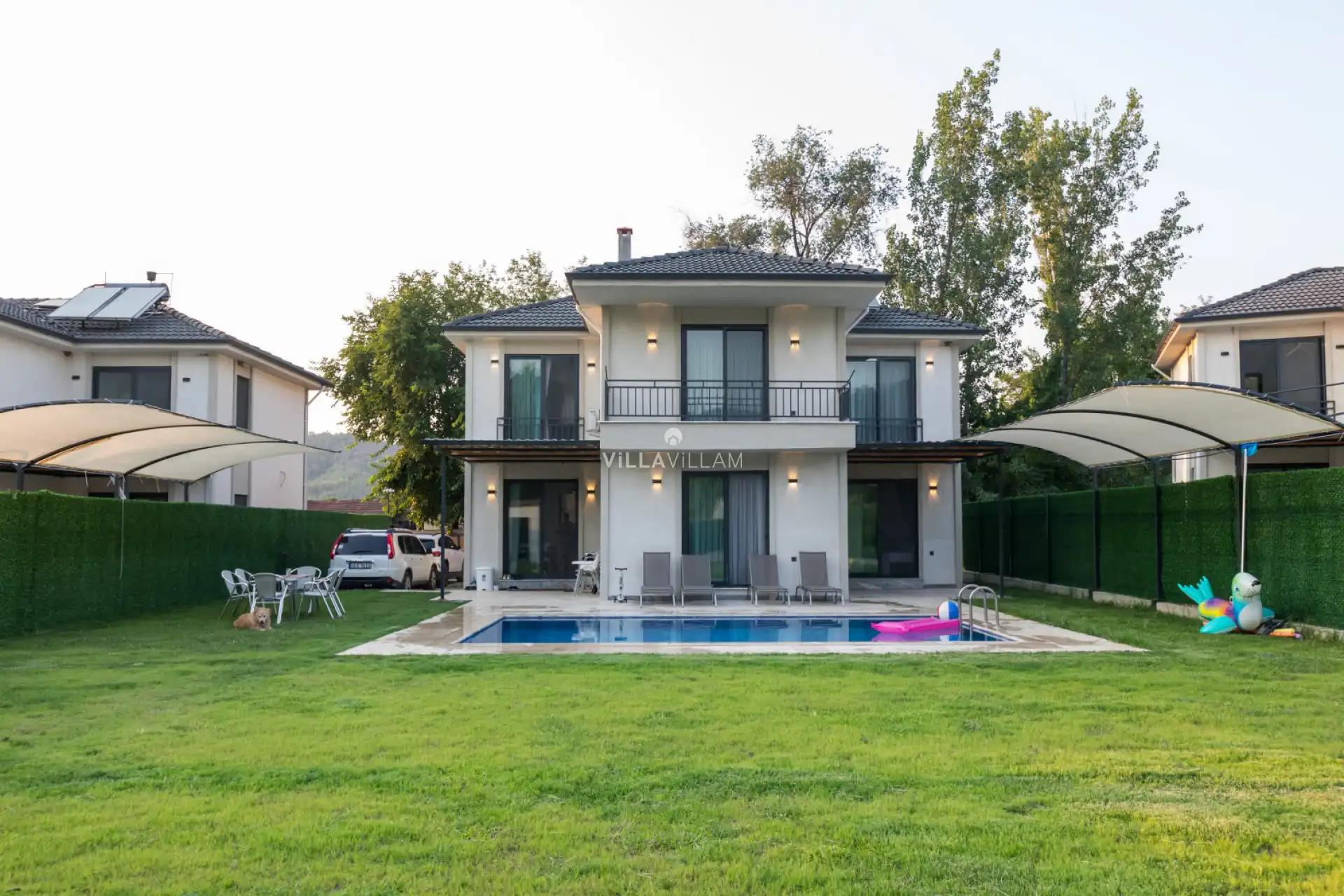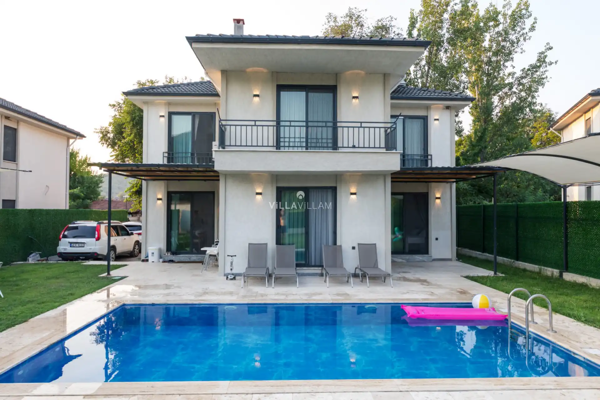 Tüm yılın yorgunluğundan sıyrılabileceğiniz villamız şehir kargaşasından uzak unutulmayacak bir tatil deneyimi vadetmektedir. Yorgunluğunuzu ve stresinizi geride bırakacağınız, sevdikleriniz ve aileniz ile unutulmayacak anılar biriktirebileceğiniz geniş yemyeşil bahçe alanı ve havuz alanında şezlong takımı, oturma grubu ve barbekü alanı bulunmaktadır. İç mekanda tüm ihtiyaçlarınıza karşılık verecek konforlu oturma odası ve donanımlı açık mutfağı; birinci yatak odasında da çift kişilik yatak ve ebeveyn banyosu; ikinci yatak odasında çift kişilik yatak; üçüncü yatak odasında iki tek kişilik yatak ve banyo; dördüncü yatak odasında çift kişilik yatak yer alırken ayrıca ortak kullanım bir banyo daha bulunmaktadır.