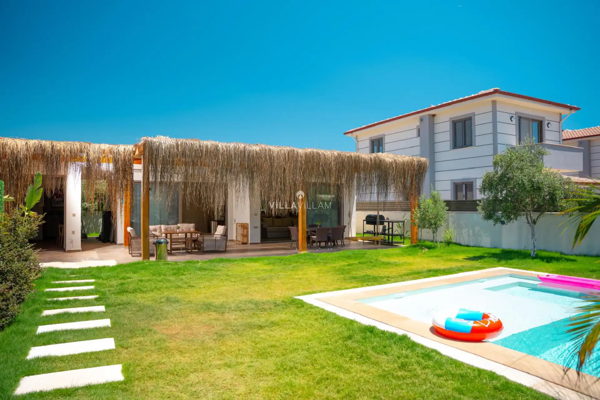 Geniş havuz ve bahçe alanında; şezlong takımı, salıncak, oturma grubu ve sevdiklerinizle keyifli zaman geçirebilmeniz için düşünülmüş bir barbekü alanı bulunmaktadır. İç mekânda ise konforlu bir oturma odası ve kullanışlı bir mutfak yer almaktadır. Birinci yatak odasında çift kişilik yatak ve banyo; ikinci yatak odasında ise yine çift kişilik yatak ve banyo bulunmaktadır.