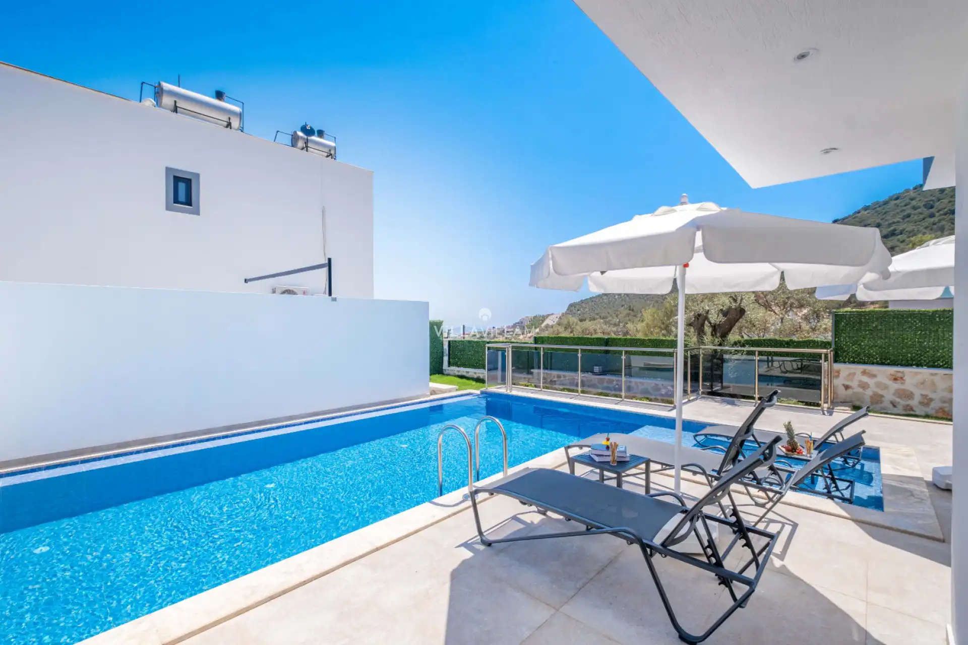 Deniz, doğa, şehir manzarasına sahip olan villanın havuz terasında kapasiteye uygun şezlong takımı, oturma grubu, barbekü alanı bulunmaktadır. Geniş ve konforlu bir oturma odası, açık mutfağı bulunan villanın,bir yatak odasında çift kişilik yatak, ebeveyn banyosu ve jakuzi, ikinci yatak odasında çift kişilik yatak ve ebeveyn banyosu; üçüncü yatak odasındaysa iki tek kişilik yatak ve ebeveyn banyosu bulunmaktadır.