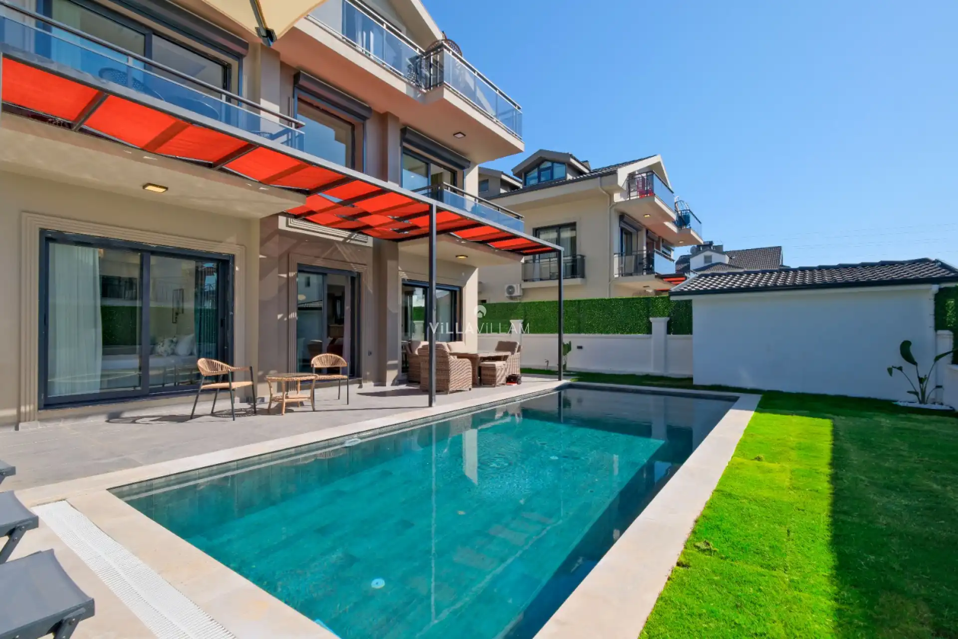 Modern ve sade çizgilerin hâkim olduğu iç mekân tasarımıyla tatilinize farklı bir hava katmayı planlayan villa, bahçe ve havuz alanı ile sadece size özel bir tatil vadetmektedir. Aynı zamanda şehir kargaşasından uzak, denize yakın tatil arayan misafirlerimiz için unutulmaz bir fırsat sunmakta olan villanın bahçe ve havuz terasında kapasiteye uygun şezlong takımı, oturma grubu, barbekü alanı ve salıncak bulunmaktadır. Havuz terasına açılan, ihtiyaçlarınıza karşılık verecek konforlu oturma odası ve tam donanımlı açık mutfağı; birinci yatak odasında çift kişilik yatak, ebeveyn banyosu, sauna ve jakuzi; ikinci yatak odasında iki tek kişilik yatak ve banyo; üçüncü yatak odasında çift kişilik yatak ve banyo; dördüncü yatak odasında çift kişilik yatak ve banyo bulunmaktadır.