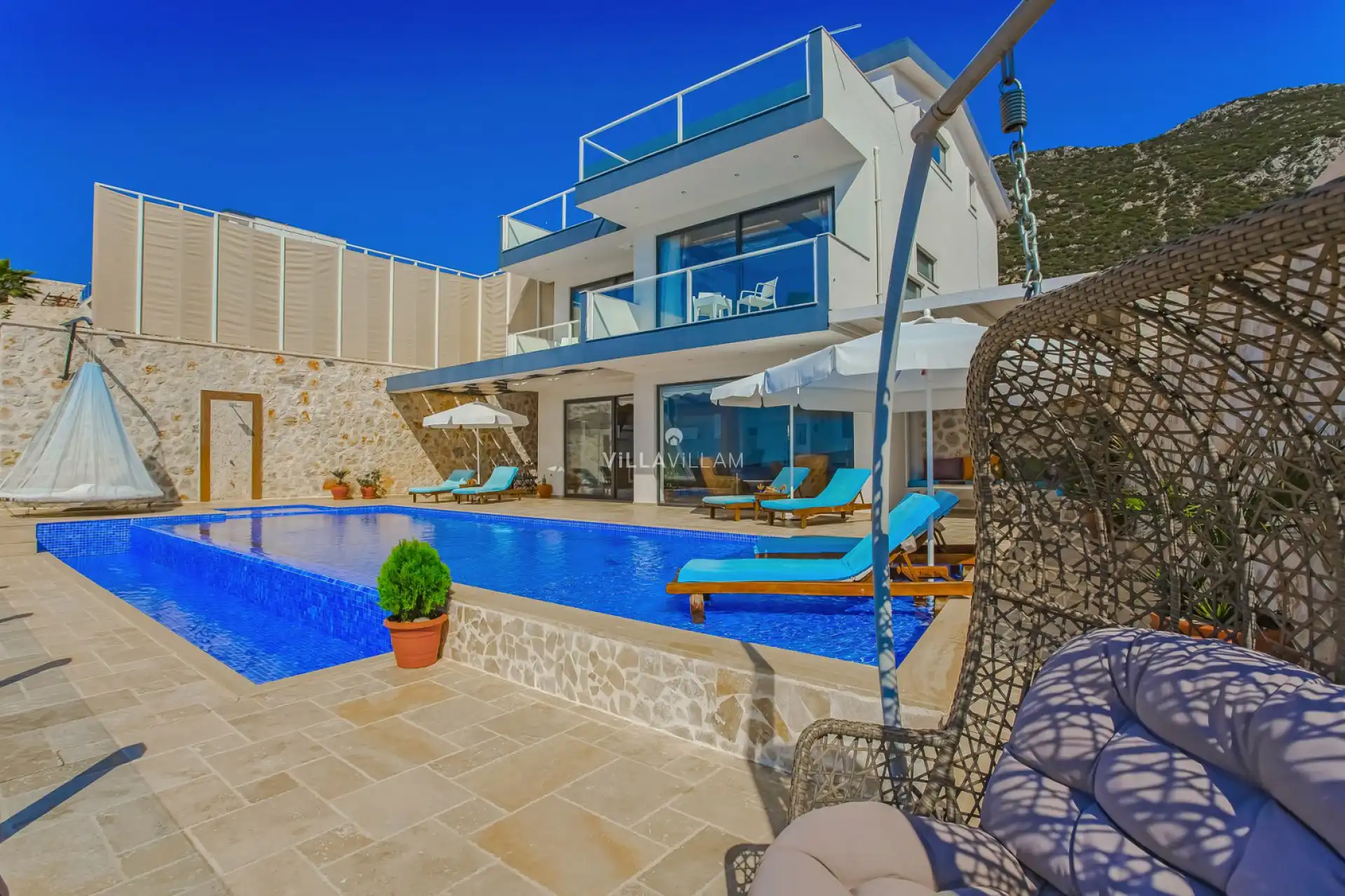 Eşsiz deniz manzarasına sahip havuz terasında şezlong takımı, oturma grubu, salıncak ve barbekü alanı bulunurken iç mekanda ise konforlu oturma odası ve tam donanımlı açık mutfağı; birinci yatak odasında çift kişilik yatak, jakuzi ve ebeveyn banyosu; ikinci yatak odasında çift kişilik yatak ve ebevyn banyosu; üçüncü yatak odasında iki tek kişilik yatak ve banyo bulunmaktadır.