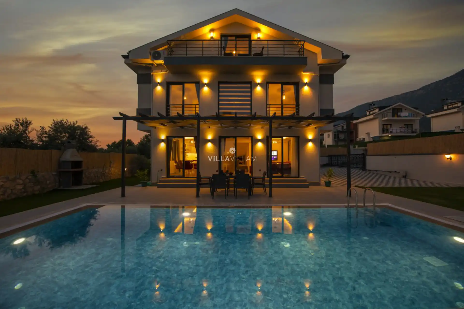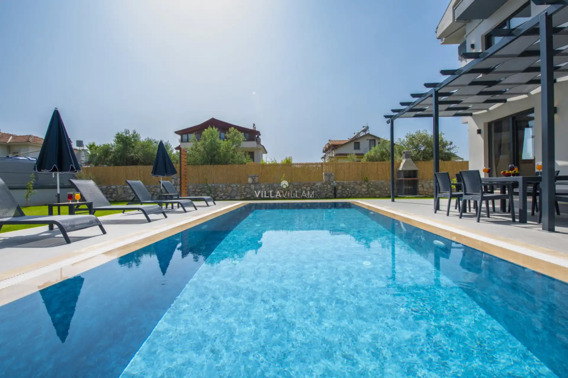 Geniş havuz ve bahçe alanında oturma grupları, şezlong takımı ve barbekü alanı yer almaktadır. İç mekanda ise konforlu oturma odası, ihtiyaçlarınızı karşılayacak donanımlı mutfağı; birinci yatak odasında çift kişilik yatak, jakuzi ve ebeveyn banyosu; ikinci yatak odasında çift kişilik yatak ve ebeveyn banyosu; üçüncü yatak odasında iki tek kişilik yatak ve banyo bulunan villa, ihtiyaçlarınıza karşılık verecek donanıma sahiptir.