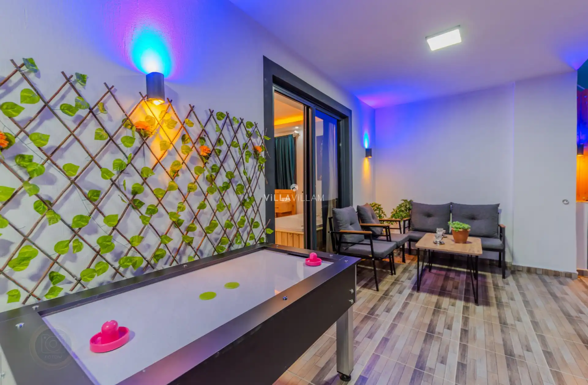 Dış mekanda şezlong takımı, oturma grubu, salıncak ve barbekü alanı bulunurken iç mekanda ise konforlu oturma odası ve tam donanımlı açık mutfağı; birinci yatak odasında çift kişilik yatak, jakuzi ve ebeveyn banyosu; ikinci yatak odasında çift kişilik yatak ve ebeveyn banyosu; üçüncü yatak odasında iki tek kişilik yatak bulunmaktadır.