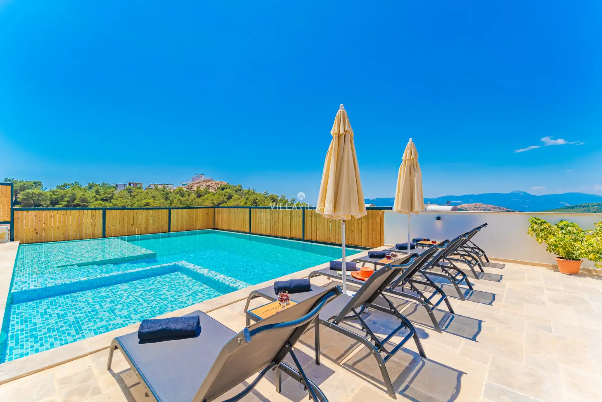 Kalkan merkeze yakın konumu ile dikkat çeken villa, misafirlerine tam olarak aradığını bulabileceği kriterlere ve olanaklara sahiptir. Doğayla iç içe konumu ve tatilinize renk katacak havuz terasında kapasiteye uygun şezlong takımı, salıncak, oturma grubu, çocuk oyun alanı, langırt ve barbekü alanı ile keyifli bir alan sunmaktadır. Villa, yeşilin her tonuyla karşı karşıya kalacağınız, doğanın saatiyle güne başlayıp bitirebileceğiniz bir tatil vadetmektedir. Geniş havuz ve bahçeye açılan konforlu oturma odası ve tam donanımlı açık mutfağı; birinci yatak odasında çift kişilik yatak, ebeveyn banyosu ve jakuzi; ikinci yatak odasında ise çift kişilik yatak ve banyo; üçüncü yatak odasında iki tek kişilik yatak bulunmaktadır.