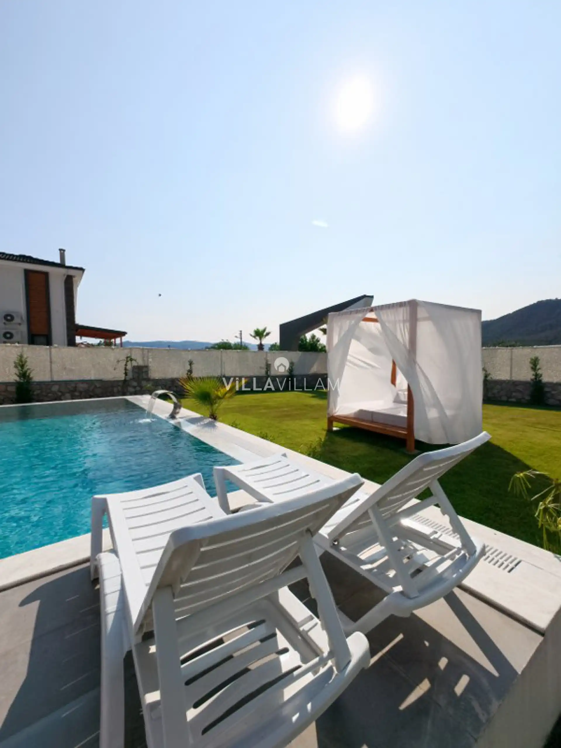 Villanın havuz terasında kapasiteye uygun şezlong takımı, oturma grubu, barbekü alanı bulunmaktadır. Geniş ve konforlu bir oturma odası, açık mutfağı bulunan villanın, birinci yatak odasında çift kişilik yatak ve ebeveyn banyosu ; ikinci yatak odasında iki tek kişilik yatak ; üçüncü yatak odasındaysa çift kişilik yatak ve ebeveyn banyosu, dördüncü yatak odasında çift kişilik yatak ve ortak kullanım banyo  bulunmaktadır.