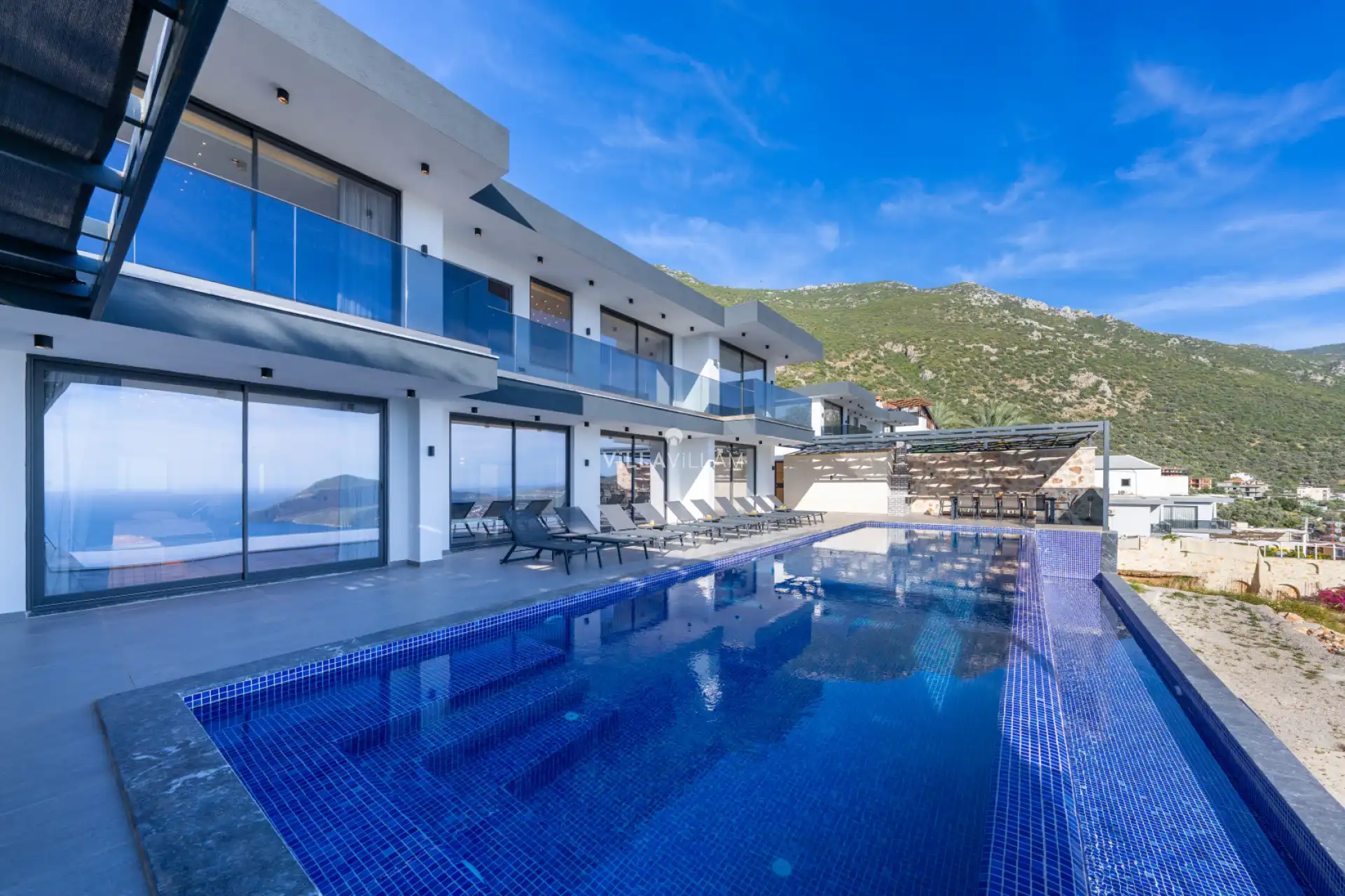 Deniz, doğa ve şehir manzarasına karşı, güneşlenip yüzebileceğiniz havuz terasında kapasiteye uygun şezlong takımı, oturma grubu ve barbekü ile keyifli bir alan sunan villanın, yine havuz terasına açılan ferah oturma odası ve tam donanımlı açık mutfağı; üç yatak odasında çift kişilik yatak, ebeveyn banyosu ve jakuzi, dördüncü ve beşinci yatak odalarında da iki tek kişilik yatak ve ebeveyn banyosu bulunmaktadır.