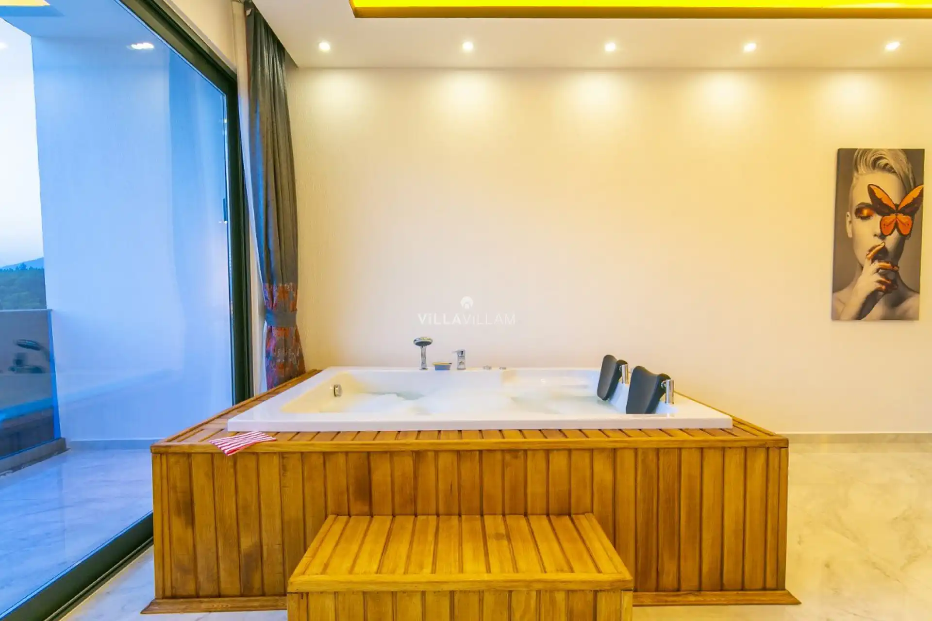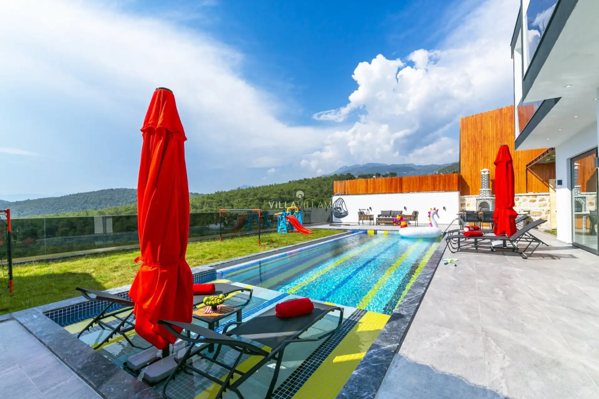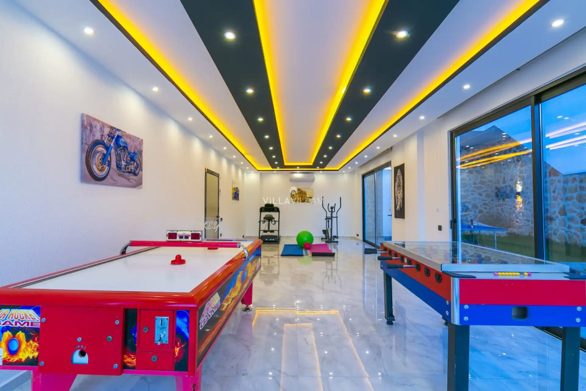 Doğa manzarasına sahip olan villanın havuz terasında kapasiteye uygun şezlong takımı, oturma grubu, barbekü; geniş bahçesinde rekreasyon mekanı olarak ayrılmış alanda airhockey, koşu bandı, eliptik bisiklet; langırt, masa tenisi, trambolin, dart, boks torbası, basket potası, badminton, tavla gibi aktivitelerinize çeşitlilik katacak detaylar bulunmaktadır. İhtiyaçlarınıza karşılık verecek konforlu oturma odası, tam donanımlı açık mutfağı bulunan villanın, birinci yatak odasında çift kişilik yatak, ebeveyn banyosu, jakuzi; diğer yatak odasında da iki tek kişilik yatak ve ebeveyn banyosu bulunmaktadır. Ayrıca sinema odası olan villada, sauna da bulunmaktadır.