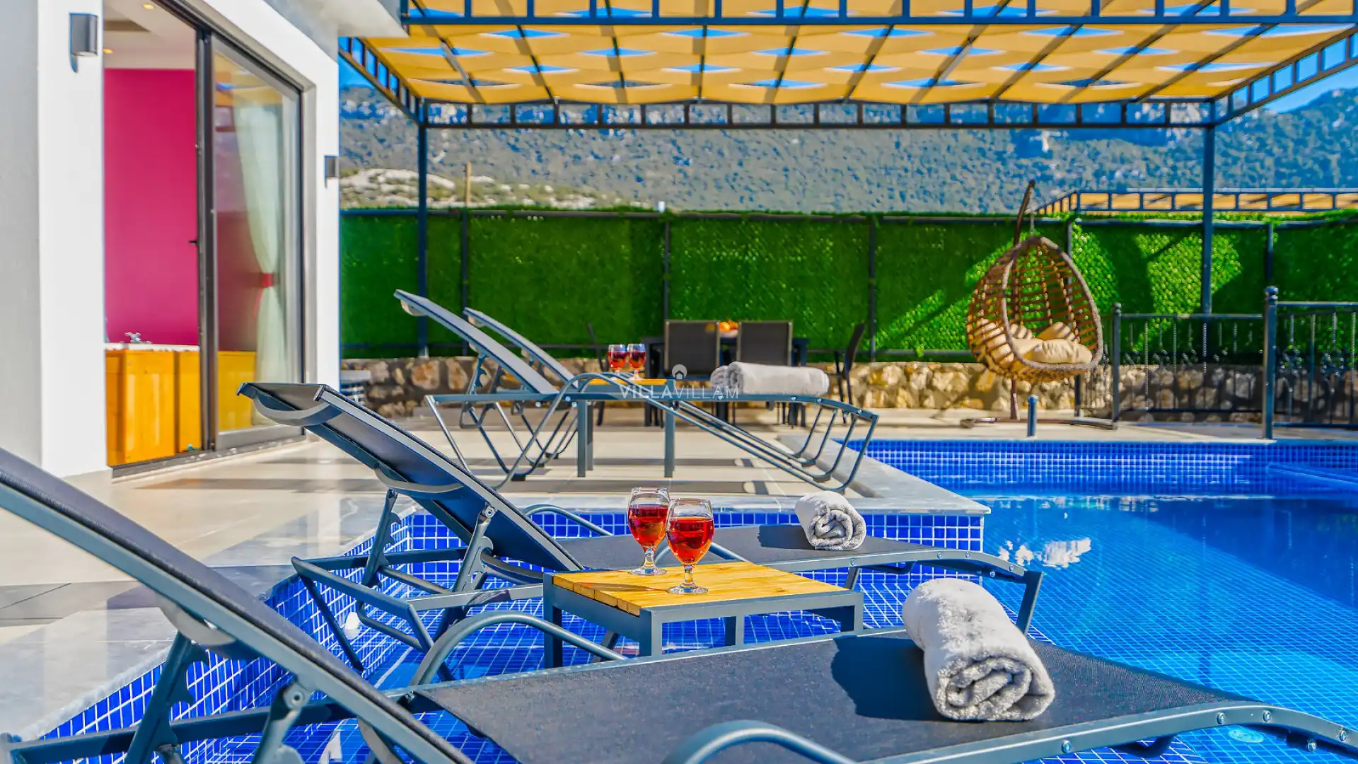 Villanın korunaklı havuz terasında, kapasiteye uygun şezlong takımı ve oturma grubu bulunmakta olup, keyifli bir tatil mekanı sunmaktadır. Yine havuz terasına açılan keyifli oturma odası ve donanımlı açık mutfağı; bir yatak odasında çift kişilik yatak, jakuzi ve ebeveyn banyosu; ikinci yatak odasında bir çift kişilik yatak, bir tek kişilik yatak ve ebeveyn banyosu bulunmaktadır.