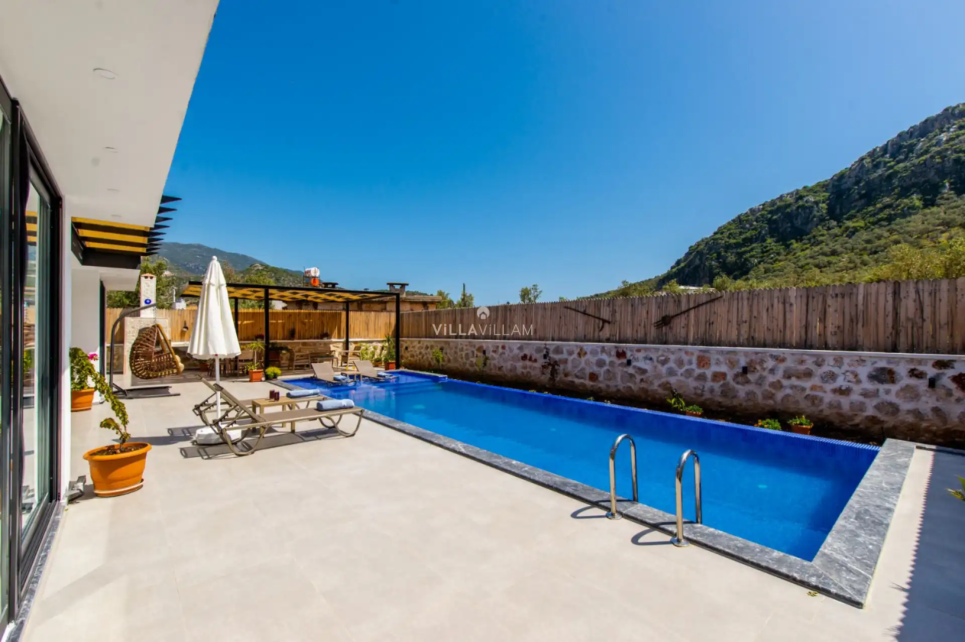 Kalkan Ulugöl mevkiinde konumlandırılan villamız 2 yatak odasıyla 4 kişilik konaklama kapasitesi sunmaktadır. Korunaklı havuz alanına sahip villamızın sığ kısmı da bulunan oldukça geniş bir havuzu bulunmaktadır. Çekirdek aile ve balayı çiftleri için ideal seçenekler arasında yer alan villamız sessiz,sakin ve huzurlu bir tatil sunmaktadır. İç mekanı da oldukça geniş ve konforlu bir alan sunan villanın ebeveyn odasında jakuzi de yer almaktadır.