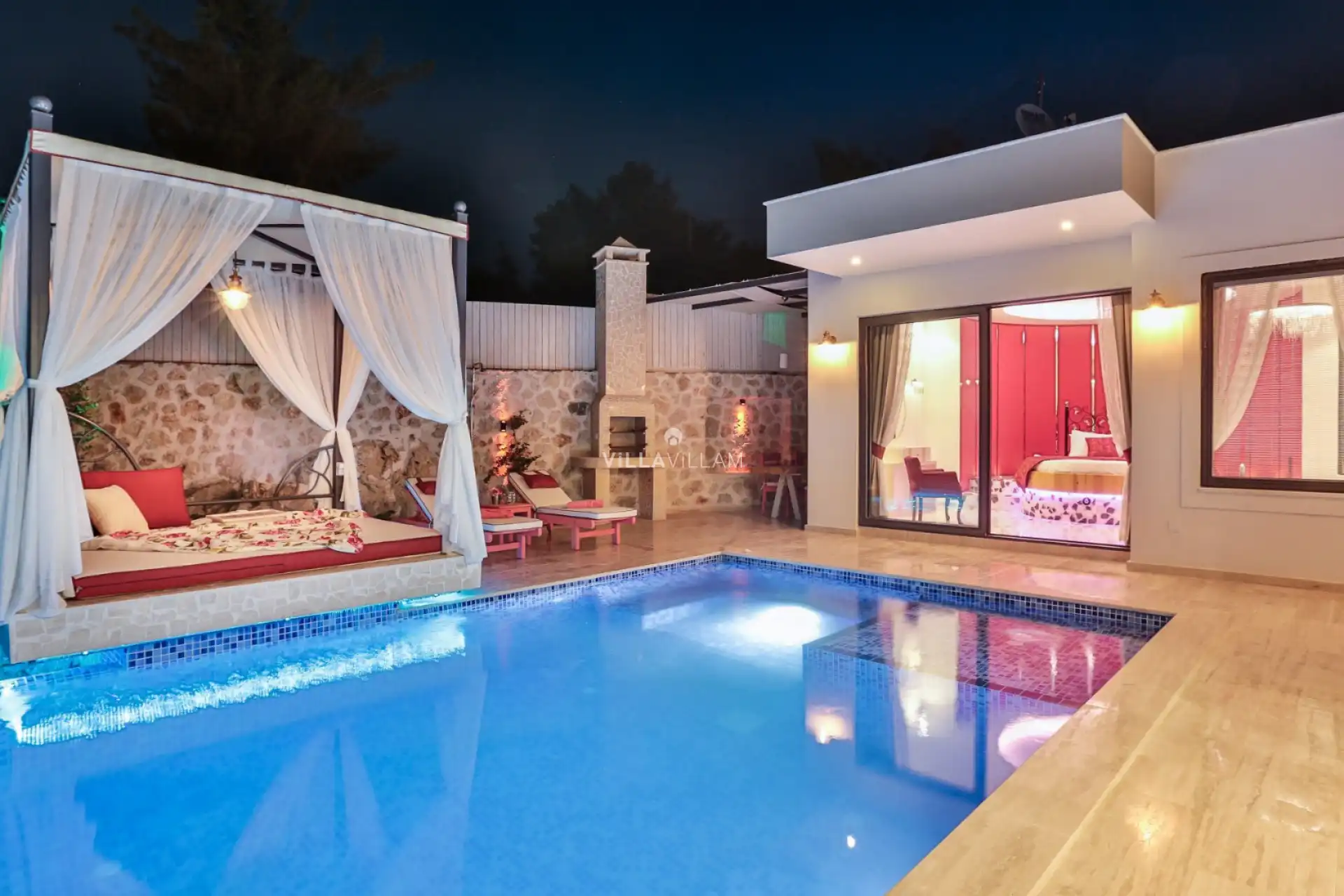 Kalkan Üzümlü bölgesinde konumlandırılan villamız, 1 yatak odasıyla 2 kişilik konaklama kapasitesi sunmaktadır. Korunaklı havuz alanına sahip villamız, çekirdek aileler ve balayı çiftlerimizin seçenekleri arasında üst sıralarda yer almaktadır.