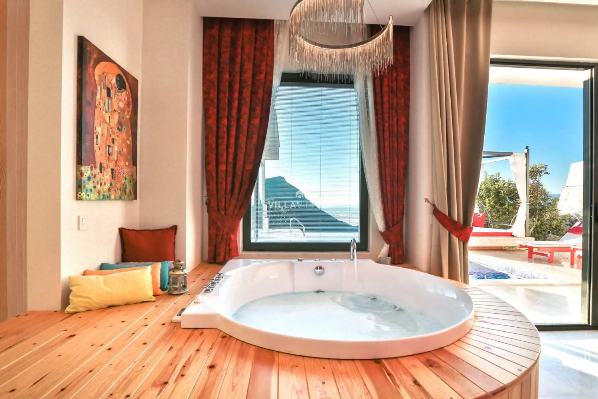 Kalkan'ın muhteşem doğasında tüm yorgunluğunuzdan arınacağınız, özenle döşenmiş bahçe ve havuz alanı ile en özel tatil anılarınıza ev sahipliği yapacak villamız; geniş havuz alanı ve kış sezonunda da tatil beklentileriniz göz önüne alınarak hizmetinize sunulan jakuzi ile kendinizi özel hissedeceğiniz bir tatil imkânına sahiptir. Konforunuz göz önünde bulundurularak dizayn edilmiş, geniş ve modern tasarlanmış villamızın yatak odasında çift kişilik yatak, jakuzi ve banyo bulunmaktadır.