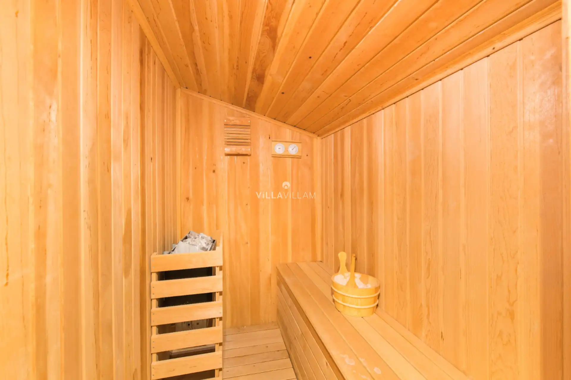 Deniz doğa şehir manzaralı ve merkezi konuma sahip olan villanın havuz terasında kapasiteye uygun şezlong takımı, oturma grubu, barbekü alanı; çocuk havuzu ve şark köşesi bulunmaktadır. Geniş ve konforlu bir oturma odası, açık mutfağı ve de sauna bulunan villanın, 1 yatak odasında çift kişilik yatak, ebeveyn banyosu, terasında jakuzi; diğer yatak odasında da iki tek kişilik yatak ve banyo bulunmaktadır.