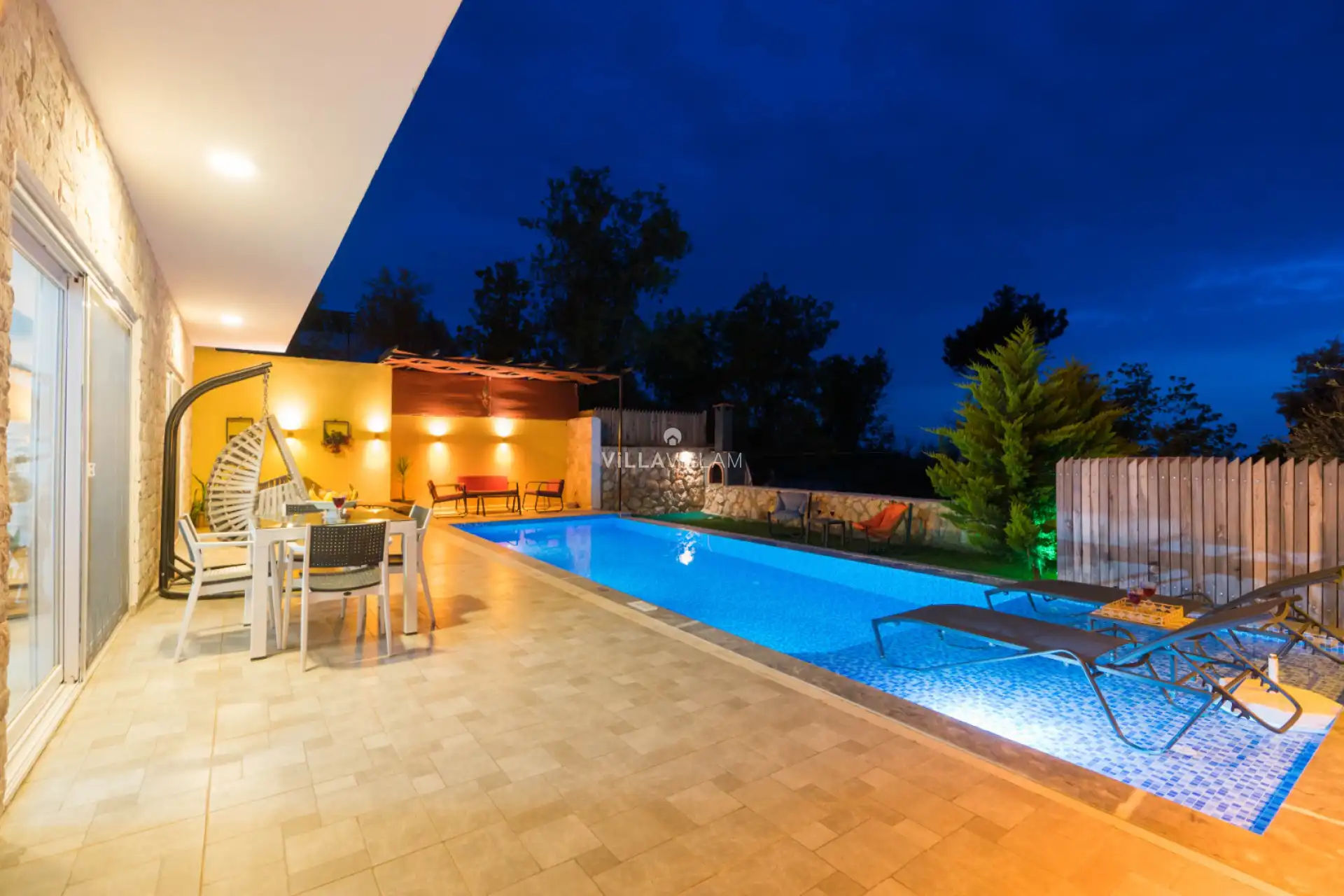 Korunaklı havuz alanına sahip olan villanın doğa içinde konumu sayesinde oksijene doyabileceğiniz, sakin bir tatil sizleri beklemektedir. Havuz terasında kapasiteye uygun şezlong takımı, oturma grubu, barbekü alanı ve salıncak bulunmaktadır. Doğa içinde huzurlu konumunuyla, sizlere keyifli bir tatil için kapı aralamaktadır.