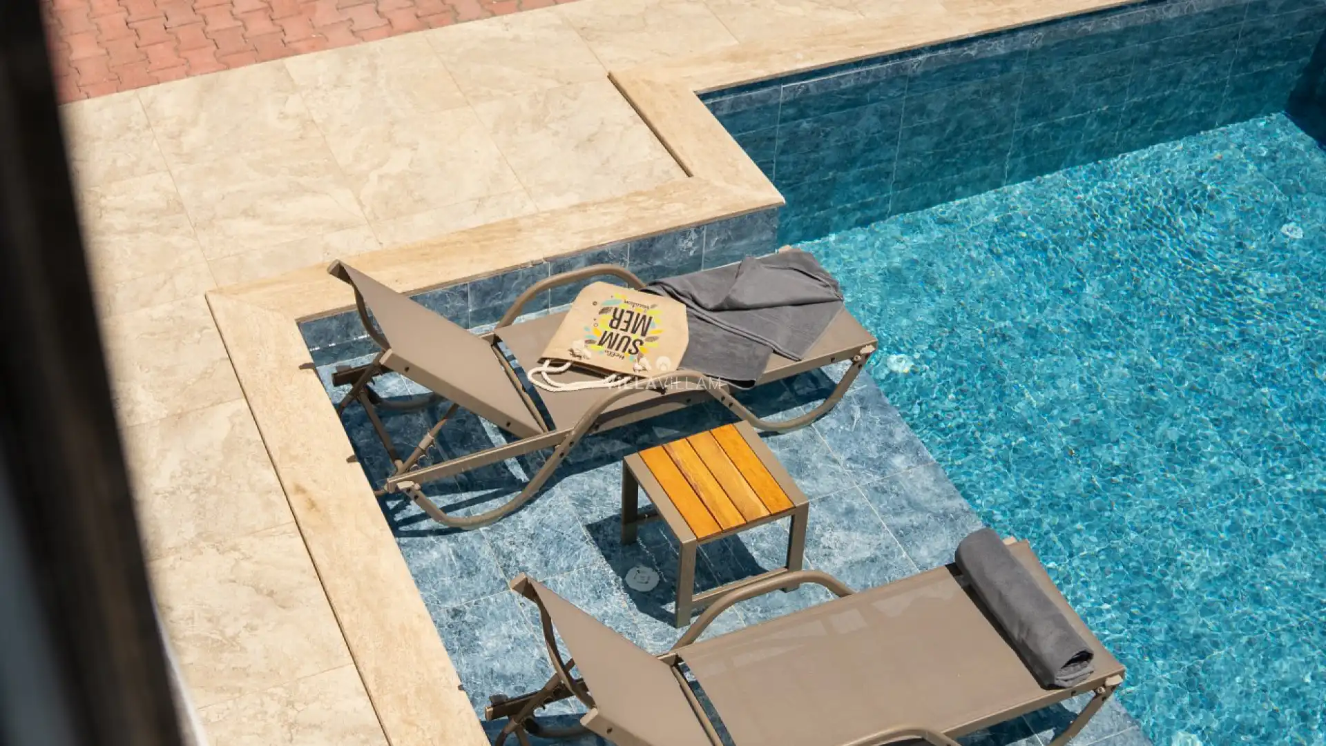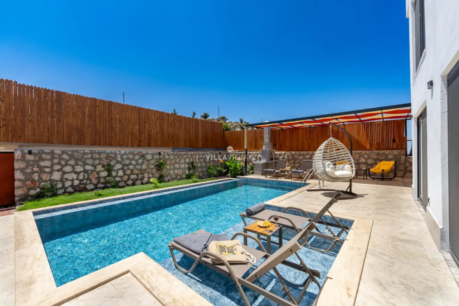 Villanın geniş havuz terasında şezlong takımı, oturma grubu ve barbekü alanı yer almaktadır. İç mekânda ise konforlu oturma odası ve donanımlı açık mutfağı; birinci yatak odasında çift kişilik yatak, jakuzi ve ebeveyn banyosu; ikinci yatak odasında iki tek kişilik yatak ve banyo; üçüncü yatak odasında ise iki adet tek kişilik yatak ve banyo bulunmaktadır.