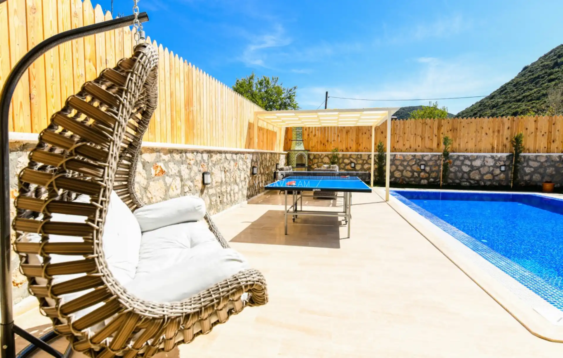 Kalkan Bezirgan bölgesinde bulunan villa, 2 yatak odasıyla 4 kişilik konaklama kapasitesi sunmaktadır. Jakuzi ile ön plana çıkan villa, korunaklı havuz alanıyla çekirdek aile ve balayı çiftleri için uygundur.