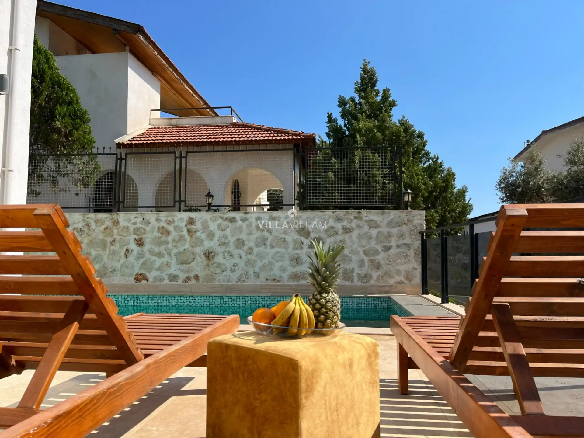Konforlu havuz alanında güneşlenip yüzebileceğiniz havuz terasında, kapasiteye uygun şezlong takımı, oturma grubu ve barbekü ile keyifli bir alan sunan villanın; yine havuz terasına açılan ferah oturma odası ve tam donanımlı açık mutfağı, toplamda üç yatak odasında çift kişilik yatak ve ebeveyn banyosu; bir odasında ise iki tek kişilik yatak ve ebeveyn banyosu bulunmaktadır.