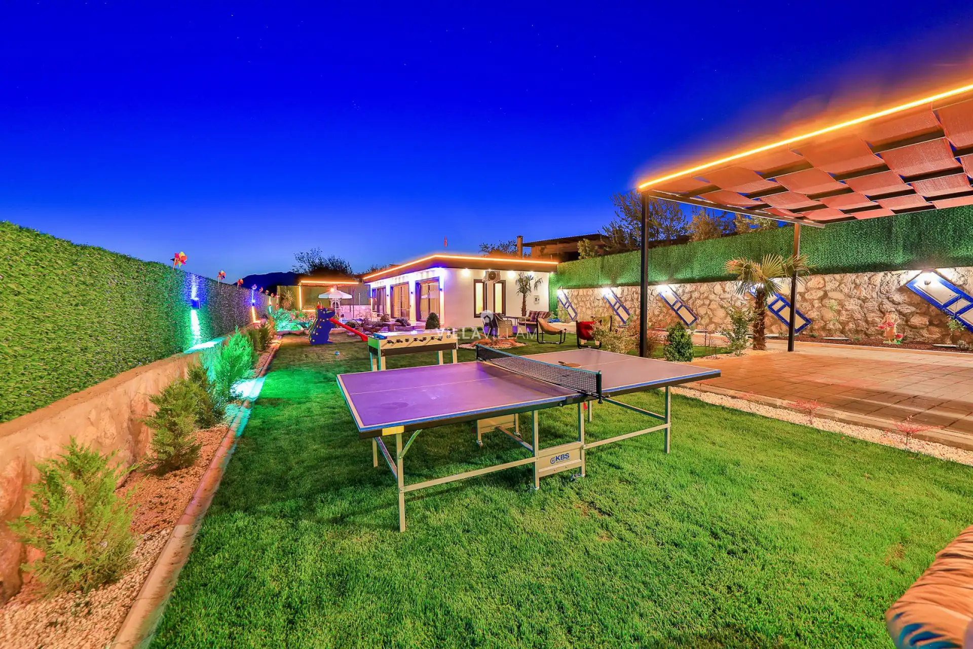Temiz havanın, gökyüzünün ve güneşin hiç eksilmediği havuz ve bahçe alanında bitmesini isteyeceğiniz bir tatil sizleri bekliyor. Şehirden uzak, sakin tatil arayan misafirlerimizin tam olarak aradığını bulacağı kriterlere ve olanaklara sahip villa; doğayla iç içe konumu ve tatilinize renk katacak havuz terasında kapasiteye uygun şezlong takımı, salıncak, oturma grubu ve barbekü alanı ile keyifli bir alana sahiptir. Geniş havuz ve bahçesine açılan konforlu oturma odası ve tam donanımlı açık mutfağı; birinci yatak odasında çift kişilik yatak, ebeveyn banyosu ve jakuzi; ikinci yatak odasında ise iki tek kişilik yatak ve banyo bulunmaktadır. Eğlenceli vakit geçirebilmeniz için donatılmış villa bahçesinde, tatilinizin en keyifli anlarını yaşayabilirsiniz.