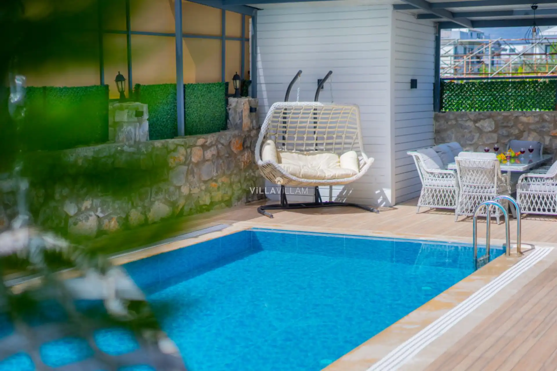 Güneşin ve havanın doyasıya tadını çıkarabileceğiniz villa iç mekan tasarımı ile tatilinize farklı bir hava katmayı planlamaktadır. Şehir merkezine yakın aynı zamanda da şehir kargaşasından uzak ve denize yakın tatil arayan misafirlerimiz için unutulmaz bir fırsat sunmakta olan villa bahçe ve havuz terasında şezlong takımı, oturma grubu, barbekü alanı ve salıncak bulunmaktadır. Havuz terasına açılan ihtiyaçlarınıza karşılık verecek konforlu oturma odası, tam donanımlı açık mutfağı; birinci yatak odasında çift kişilik yatak ve ebeveyn banyosu; ikinci yatak odasında çift kişilik yatak ve ebeveyn banyosu; üçüncü yatak odasında çift kişilik yatak ve ebeveyn banyosu bulunmaktadır.