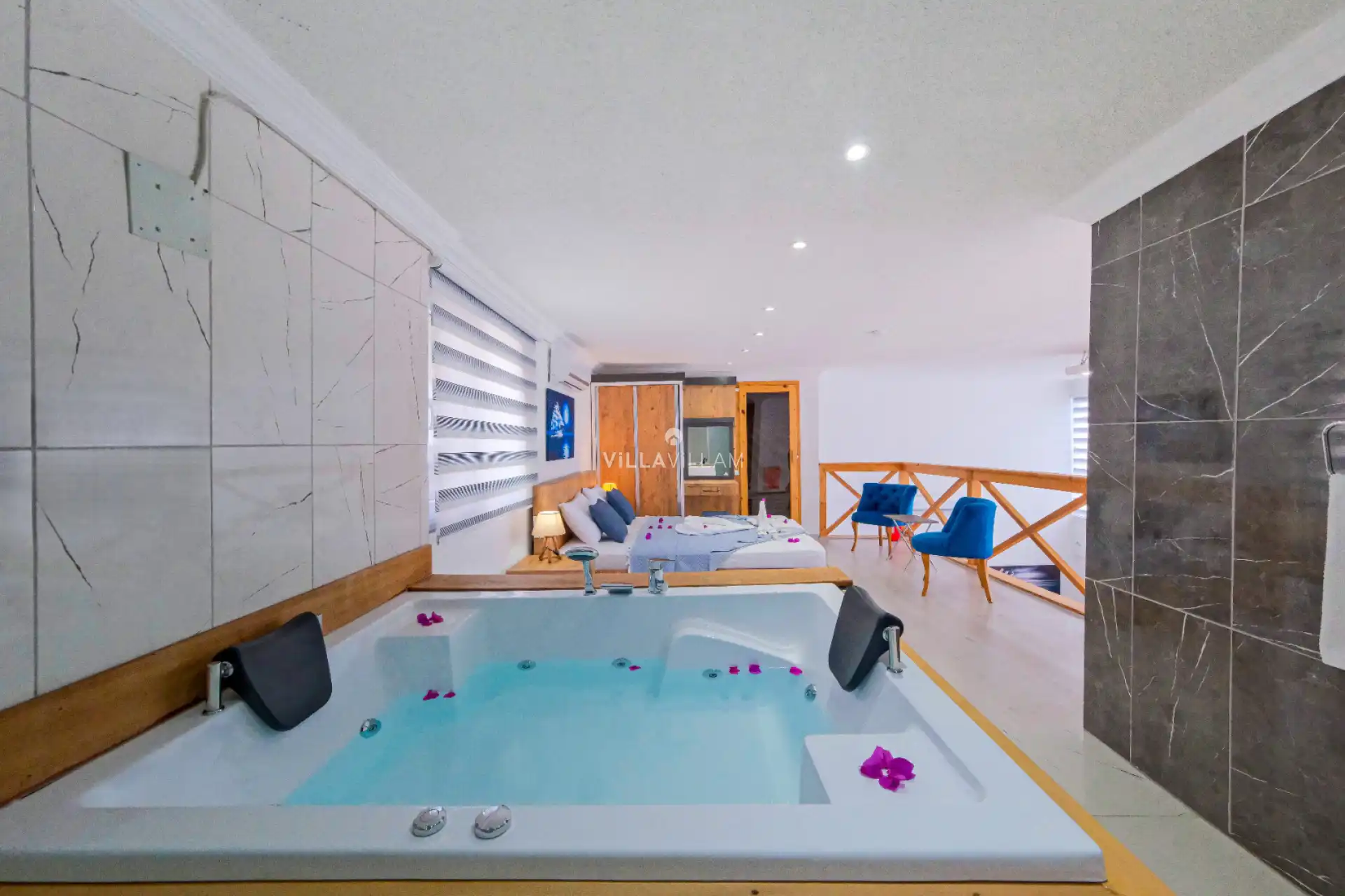 Korunaklı havuz alanına sahip villamız muhafazakar bir tatil için ideal seçeneklerden bir tanesidir. Sauna sistemine sahip villamızın yatak odasında konumlandırılmış geniş bir jakuzisi de yer almaktadır. Havuz terasına açılan oturma odasında konforlu oturma grubu, donanımlı açık mutfağı bulunmaktadır. Havuz terasında şezlong takımı, salıncak ve barbekü alanı bulunmaktadır.