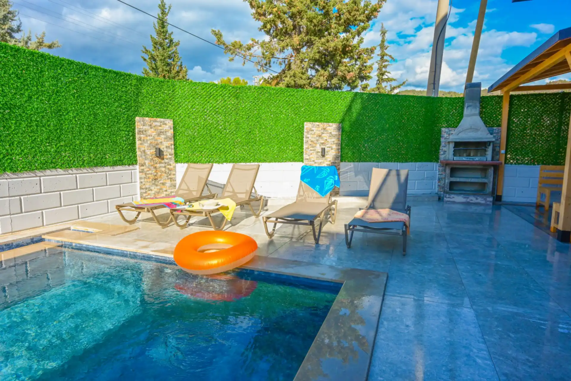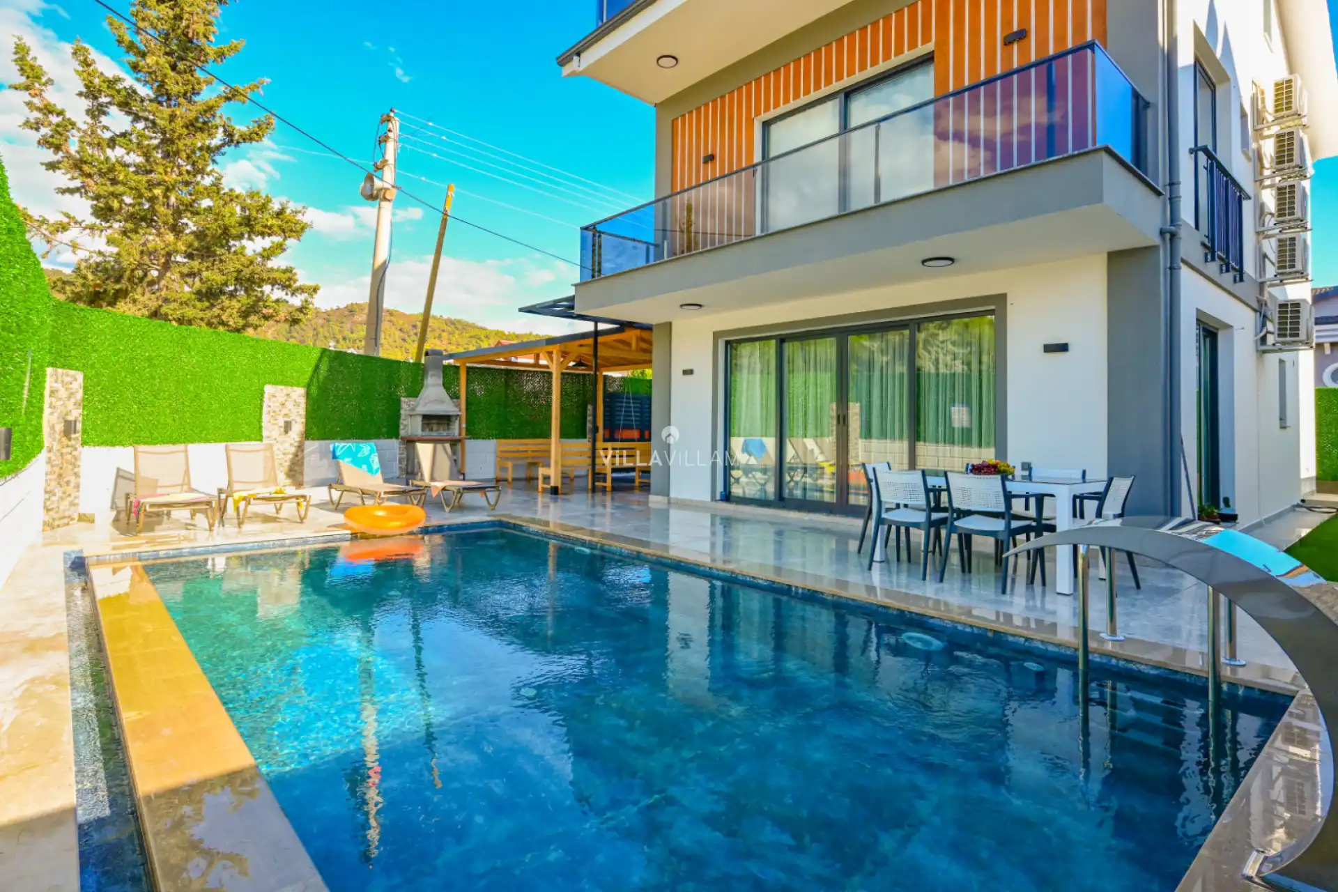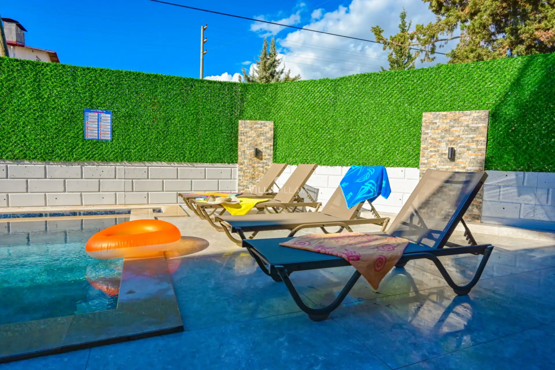 Doğanın içinde sakin konumu ve modern tasarımı ile dikkatleri üzerine çeken, sevdiklerinizle birlikte güvenli ve huzurlu bir tatilin keyfini sürebileceğiniz, özenle tasarlanmış, villanın havuz terasında şezlong takımı, oturma grubu, salıncak ve barbekü alanı bulunmaktadır. Sahip olduğu geniş havuz alanı ile sevdikleriniz ve ailenizle muhteşem günbatımları keyifli tatil anıları biriktirmenize olanak sunmaktadır. Yine havuz terasına açılan konforlu oturma odası ve donanımlı açık mutfağı; birinci yatak odasında çift kişilik yatak, ebeveyn banyosu ve balkon; ikinci yatak odasında iki tek kişilik yatak; üçüncü yatak odasında iki tek kişilik yatak ve banyo; dördüncü yatak odasında ise çift kişilik yatak, jakuzi, ebeveyn banyosu ve balkon bulunmaktadır. İki ve üçüncü yatak odaları ortak kullanım alanında bulunan banyo ve lavabo alanını kullanmaktadır.
