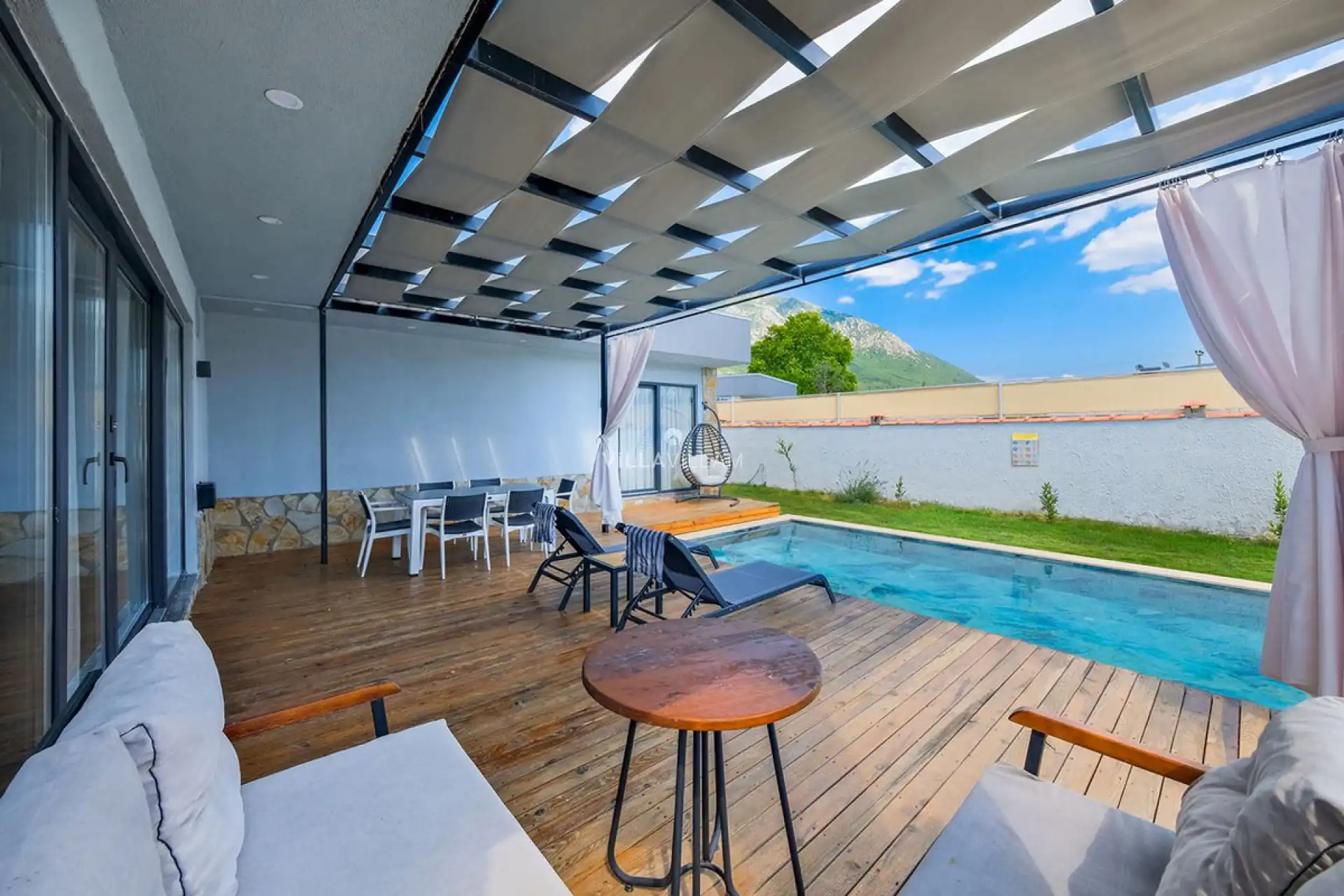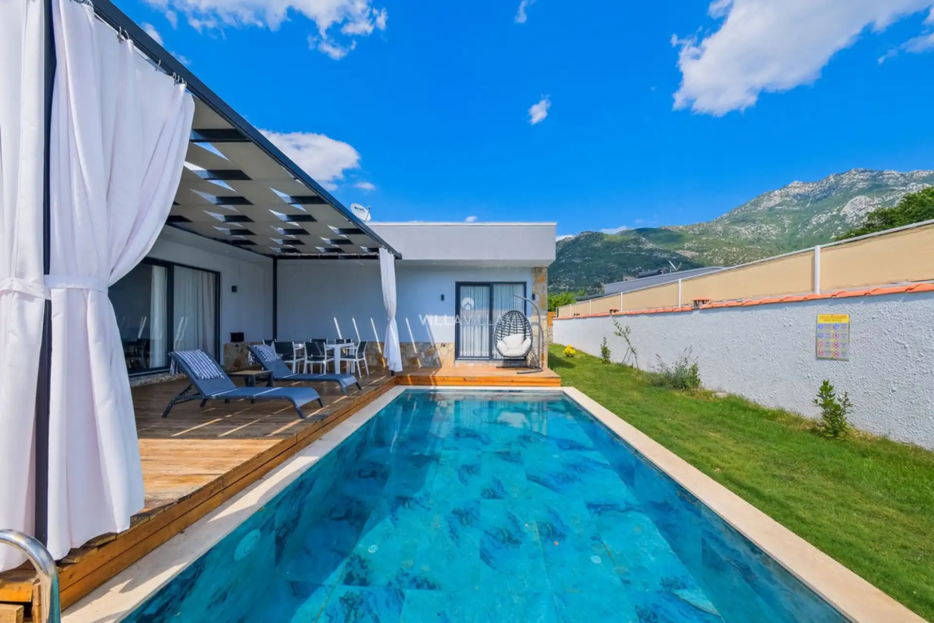 Doğa içinde huzurlu konumu sayesinde tercihlerin başında gelen villa, oldukça ferah ve geniş bahçe alanında kapasiteye uygun şezlong takımı, oturma grubu, salıncak ve barbekü alanına sahiptir. Havuz terasına açılan zevkle döşenmiş konforlu oturma odası ve tam donanımlı mutfağı, bir yatak odasında çift kişilik yatak ve ebeveyn banyosu; ikinci yatak odasında da iki tek kişilik yatak ve banyo tuvalet bulunmaktadır. Ayrıca havuz terasında bulunan jakuzi ile villa, huzurun keyfini çıkarmanıza katkı sağlayacaktır. İç mekan yapısı ve donanımları da en az dış mekan kadar ferah, modern ve konforunuz ön planda tutularak oluşturulmuştur.