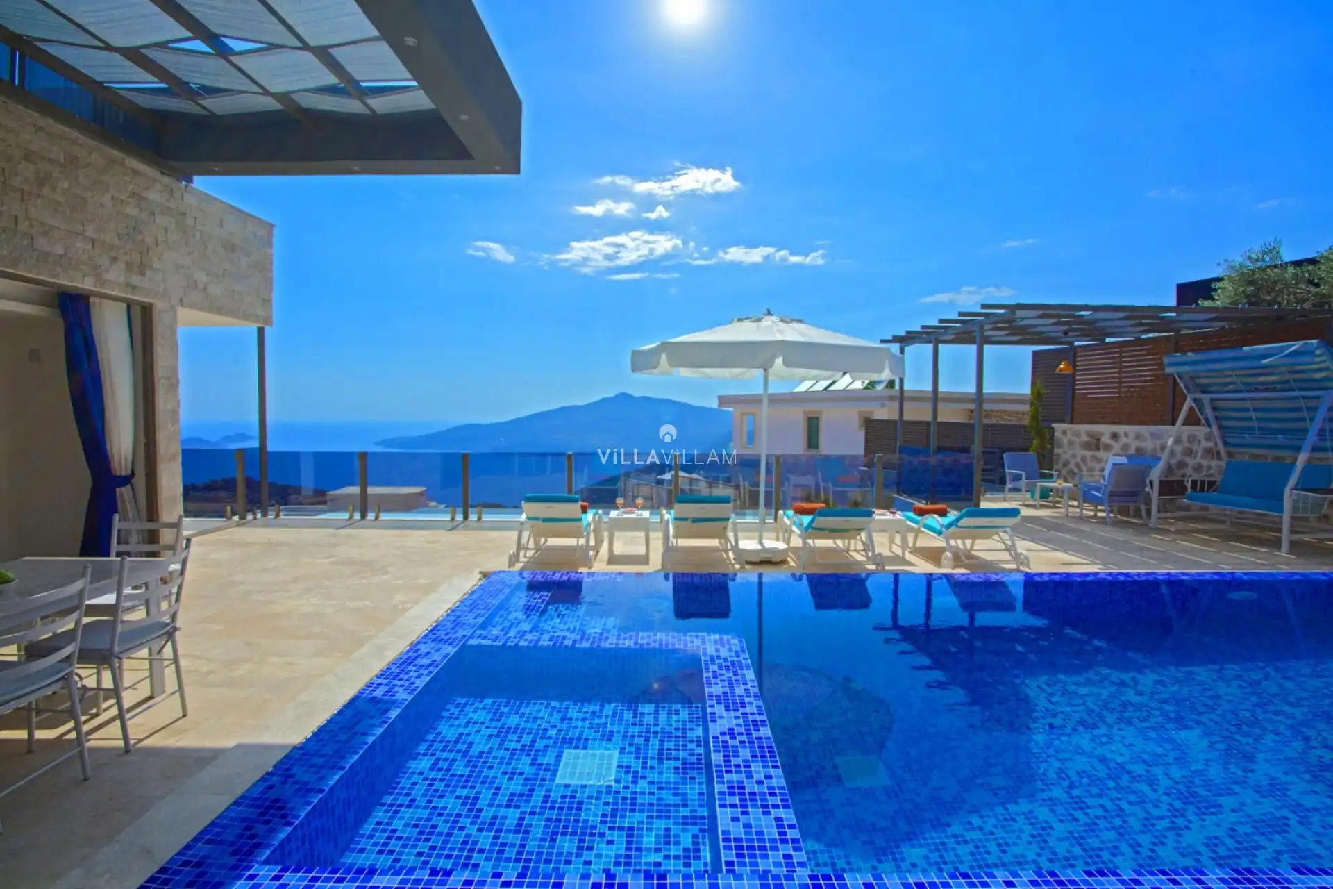 Deniz manzarasına ve şehir içinde sakin bir konuma sahip olan villa, havuz bahçesinde kapasiteye uygun şezlong takımı, oturma grubu ve barbekü ile geniş ve keyifli bir alana sahiptir. Geniş havuz ve bahçesine açılan konforlu oturma odası ve tam donanımlı açık mutfağı, bir yatak odasında çift kişilik yatak, ebeveyn banyosu ve jakuzi, ikinci yatak odasında çift kişilik yatak ve ebeveyn banyosu; üçüncü yatak odasında da iki tek kişilik yatak ve banyo bulunmaktadır. Merkezi konumuyla ve şehir, deniz manzarasıyla; ayrıca oyun masalarıyla sizlere keyifli bir tatil vadetmektedir.