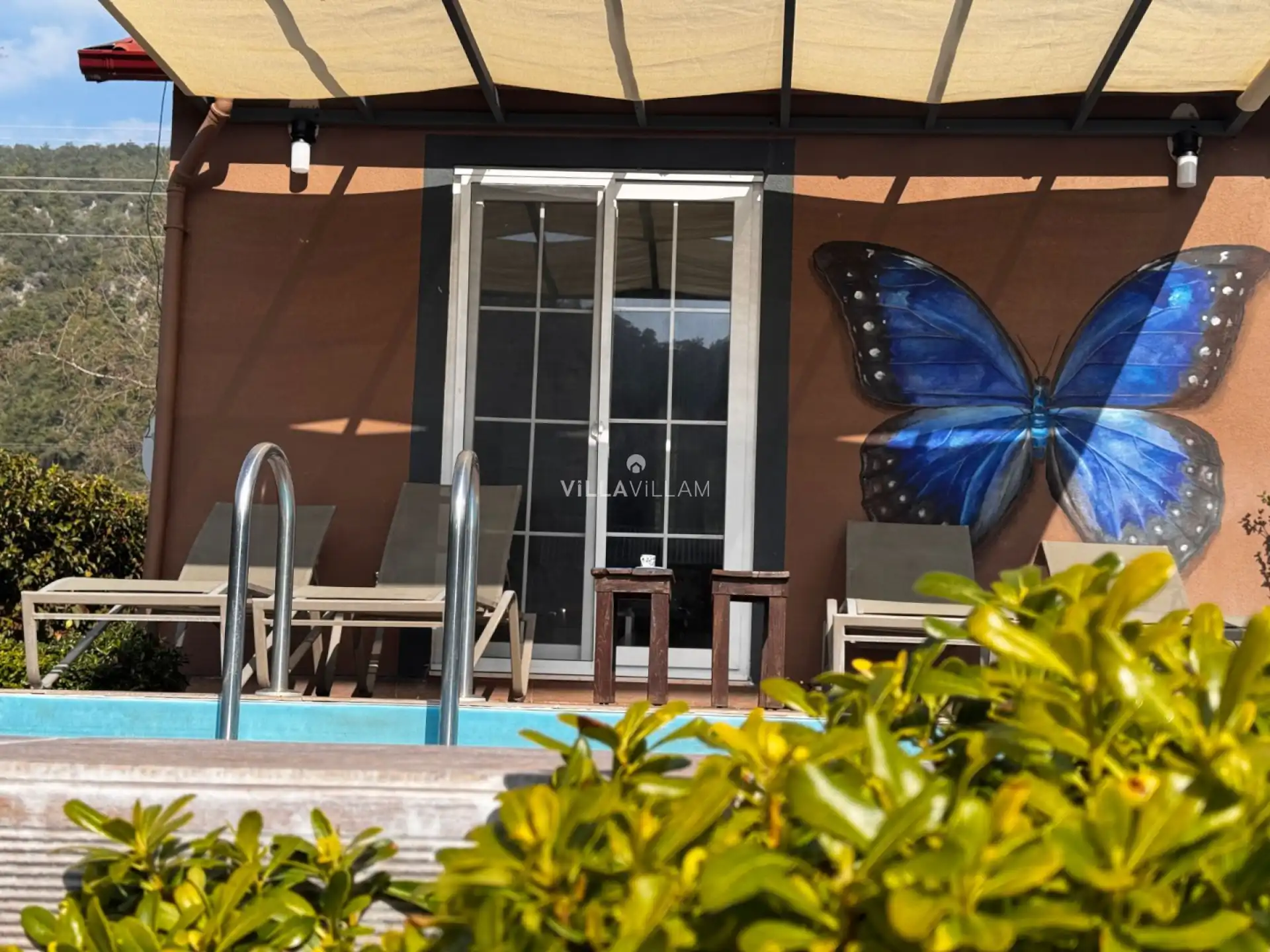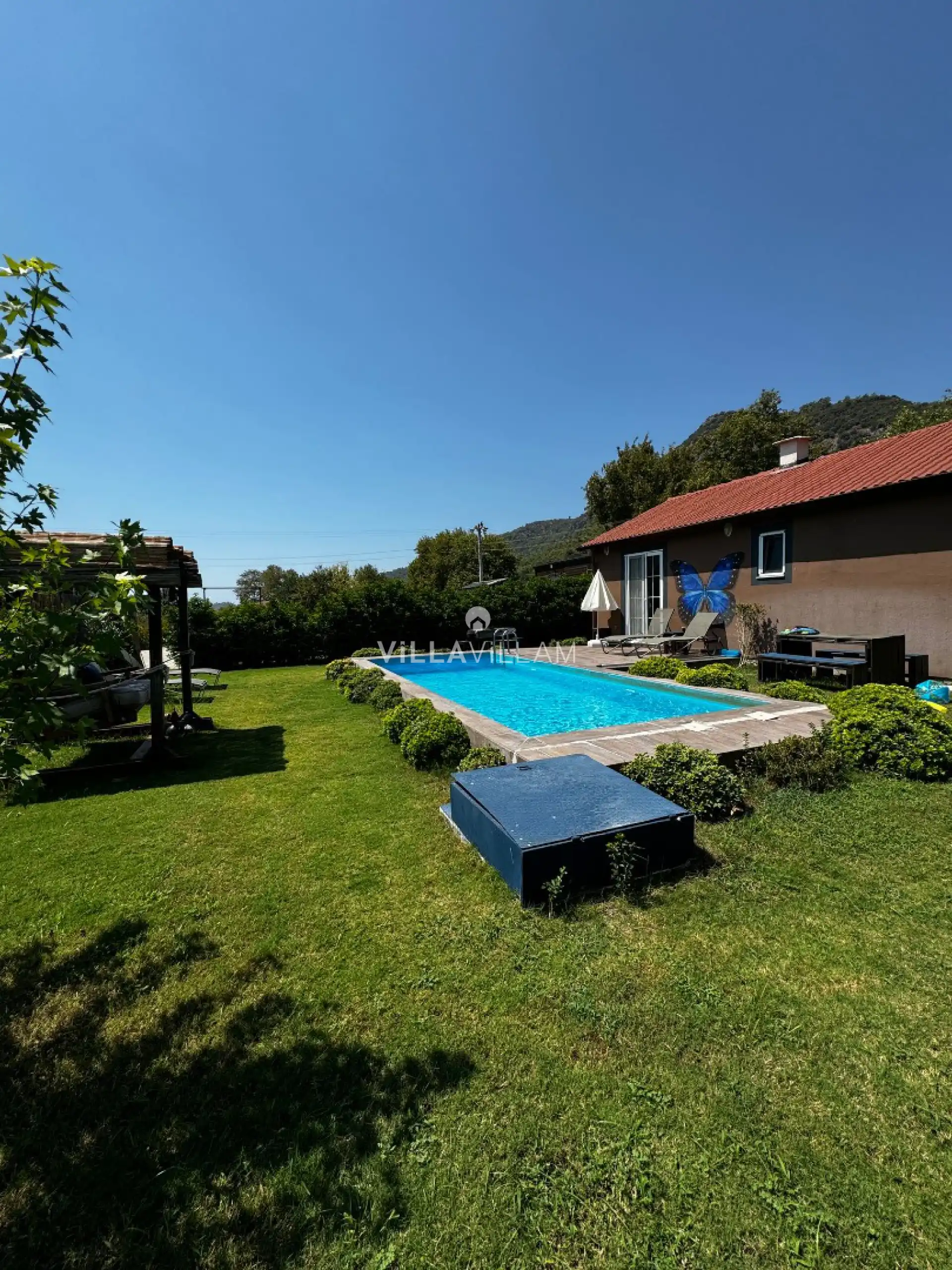 Doğa içinde, huzurlu bir konumu olan villanın havuz bahçe alanında kapasiteye uygun şezlong takımı, oturma grubu, barbekü alanı; havuz terasına açılan oturma odası, tam donanımlı açık mutfağı bulunmaktadır. Birinci yatak odasında çift kişilik yatak, ikinci yatak odasında çift kişilik yatak bulunmaktadır.