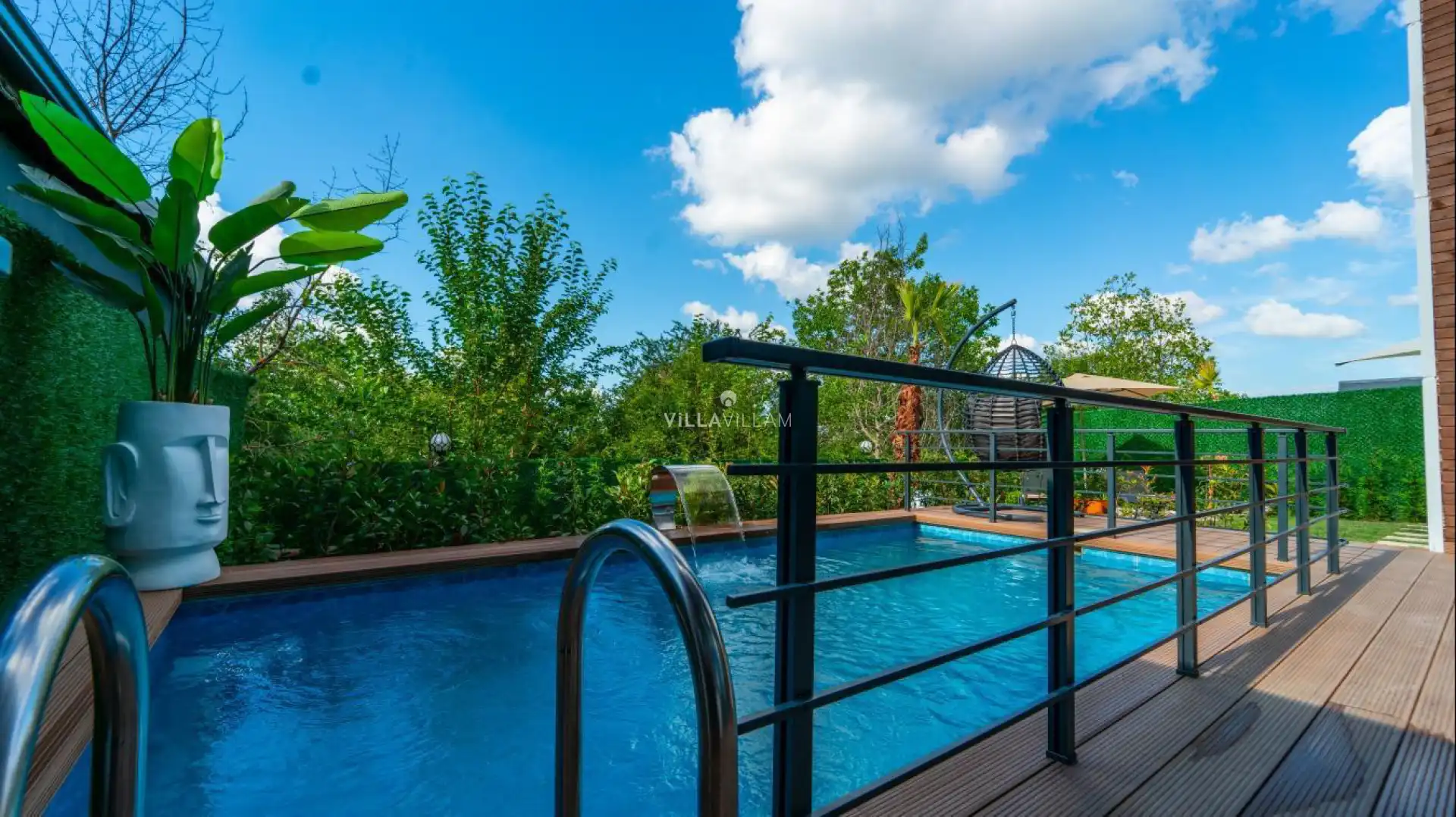 Villanın bahçe alanında şezlong takımı, oturma grubuna, salıncak bulunmaktadır. Ayrıca şömine ve ısıtmalı havuz alanına sahip olması kış dönemi için de ideal bir seçenek olarak misafirlerimizi beklemektedir. Villamızın birinci yatak odasında çift kişilik yatak ve ebeveyn banyosu; ikinci yatak odasında iki tek kişilik yatak ve ebeveyn banyosu mevcuttur.