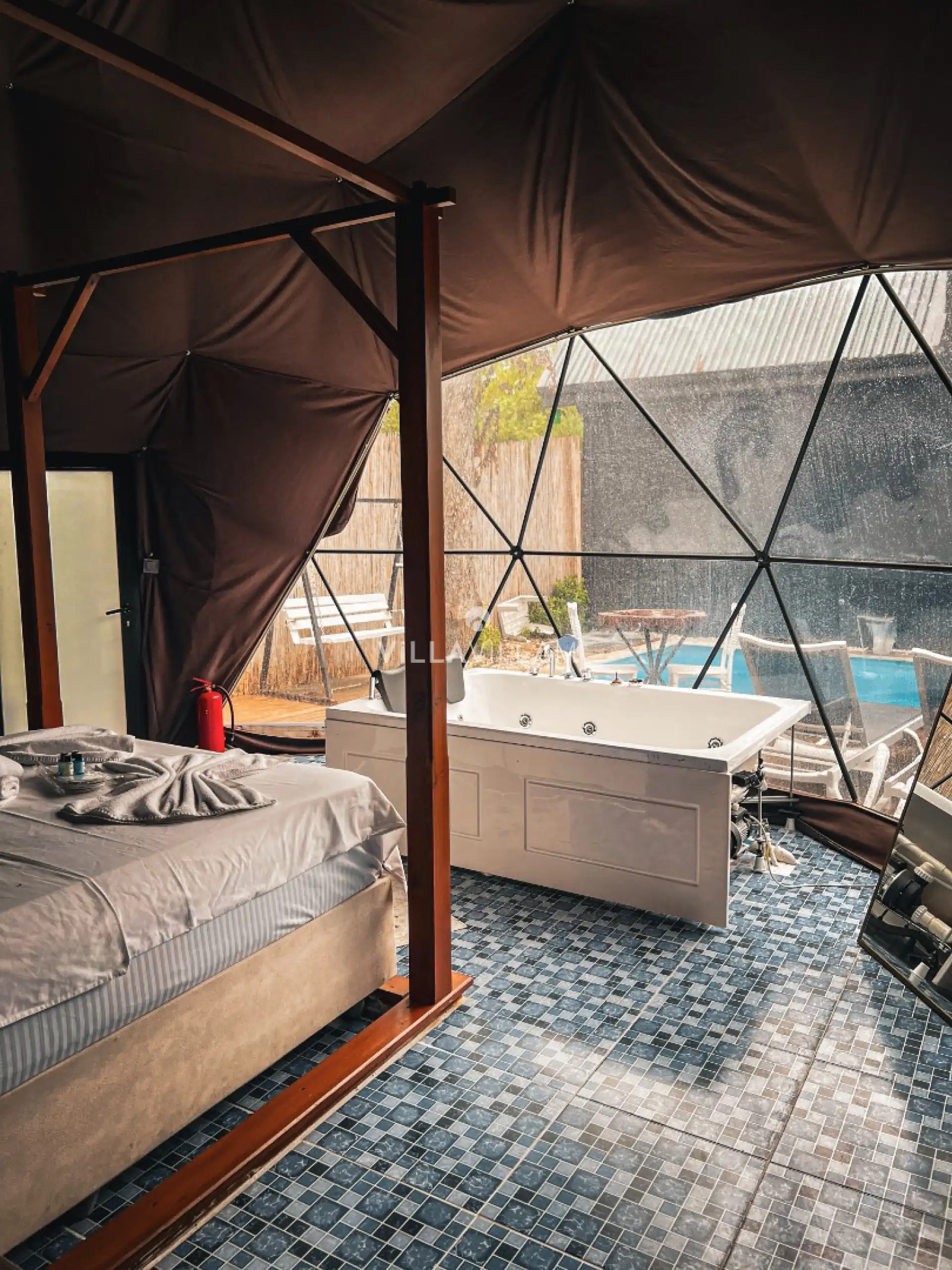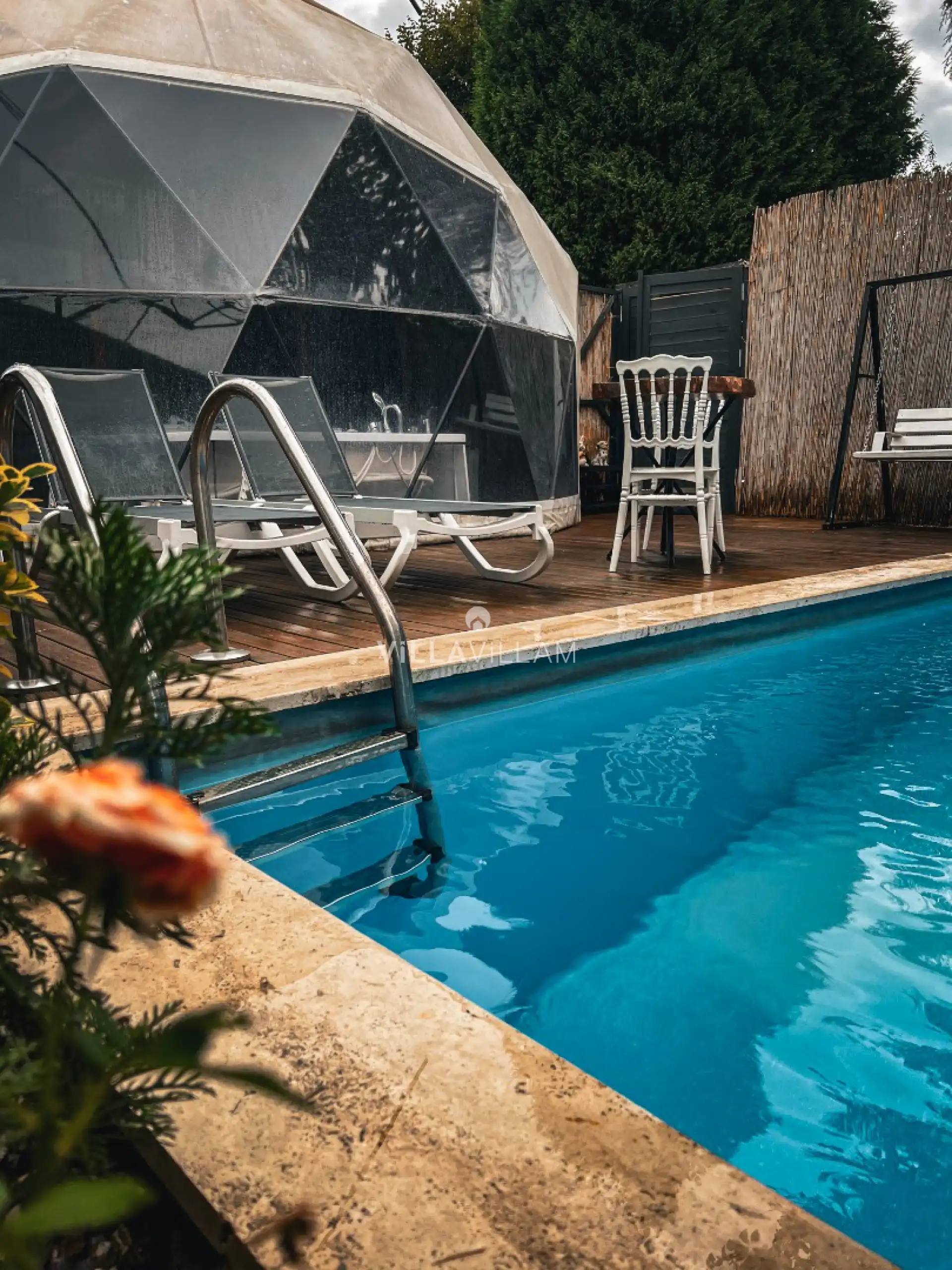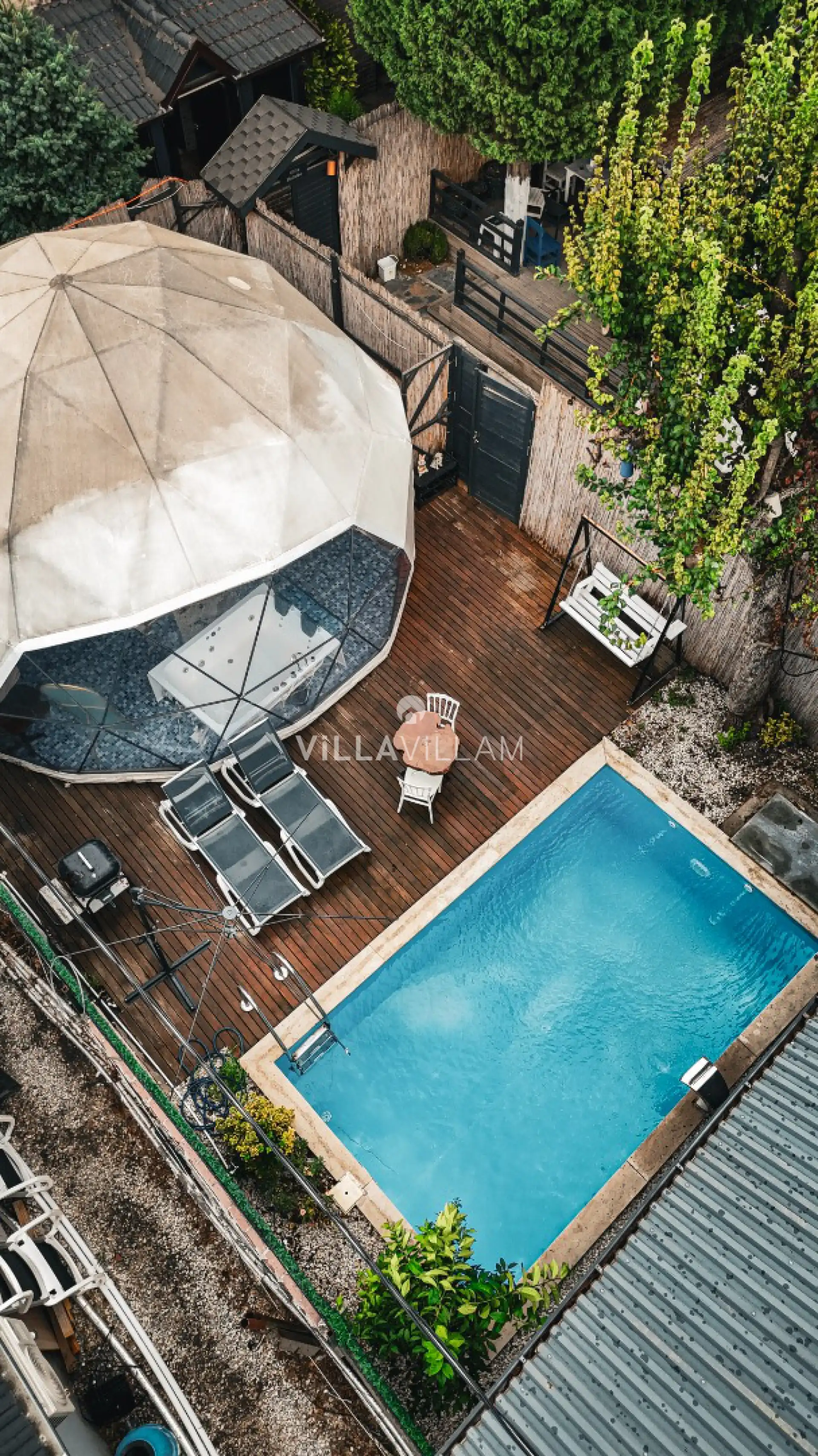 Şehrin gürültüsünden ve stresinden uzaklaşacağınız, tüm yılın yorgunluğunu atabileceğiniz, doğa içinde sakin bir konumu misafirlerine rüya gibi bir tatil vadeden villanın havuz terasında kapasiteye uygun şezlong takımı, oturma grubu, salıncak ve barbekü alanı yer almaktadır. Tüm ihtiyaçlarınıza karşılık verecek konforlu oturma odası ve minimal mutfağı; birinci yatak odasında çift kişilik yatak, jakuzi ve ebeveyn banyosu bulunmaktadır.