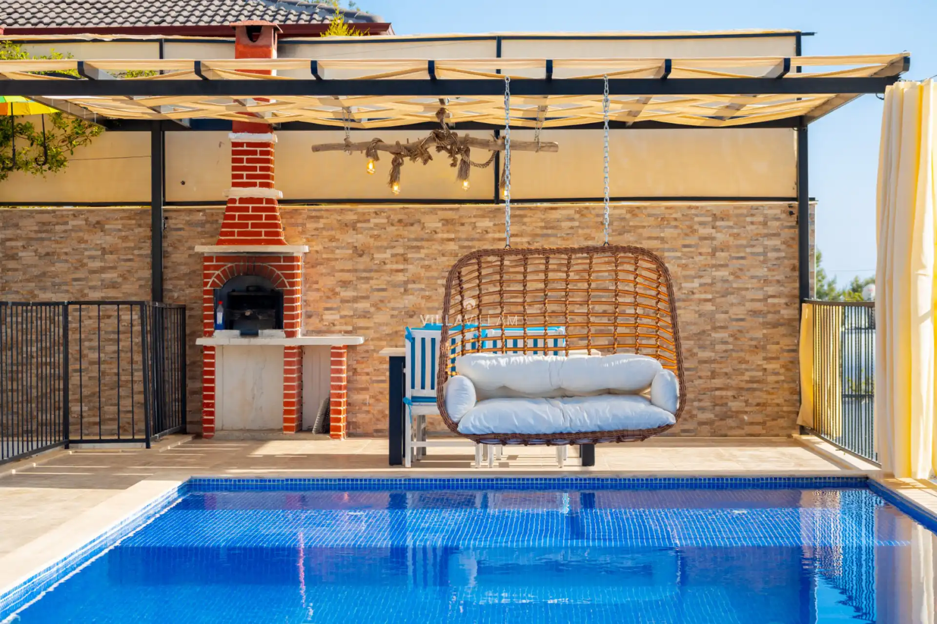 Doğa içinde, korunaklı havuz ve bahçe alanına sahip villanın konaklama kapasitesine uygun oturma alanı, şezlong takımı ve barbekü alanı; konforlu oturma odası ve ihtiyaçlarınızı karşılayacak donanımlı mutfağı bulunmaktadır. Bir yatak odasında bir çift kişilik yatak, ebeveyn banyosu ve jakuzi; diğer yatak odasında ise iki tek kişilik yatak ve banyo bulunmaktadır.