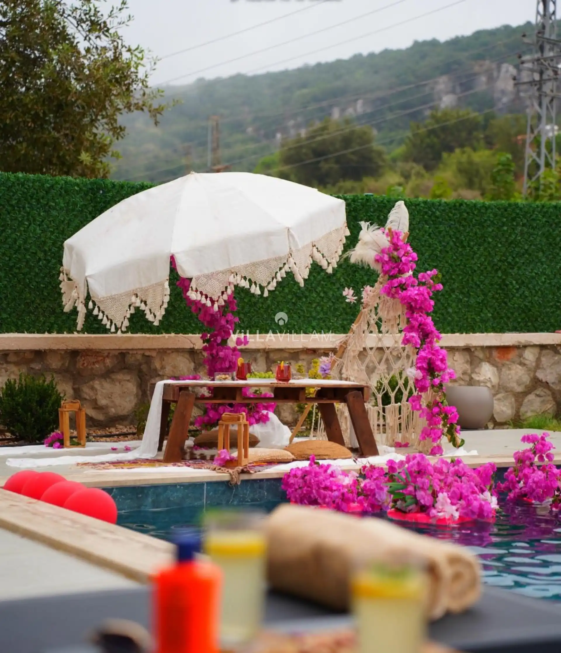 Doğa manzaralı olan tatil villamız sizlerin rahat ve konfor içinde bir tatil geçirmeniz için tüm detaylarıyla düşünülmüş ve dekore edilmiştir. Geniş havuz alanına sahip villamızda bahçe keyfinizi ikiye katlayacak oturma grupları, özel barbekü köşesi yer almaktadır. Dolu dolu bir villa tatili geçirebilmeniz adına iç donanımı da oldukça zengin özellikteki villamızın tüm mobilyaları konforlu olmasının yanında modern bir anlayışla seçilmiştir. Birinci yatak odasında bir adet çift kişilik yatak ve ebeveyn banyosu; ikinci yatak odasında çift kişilik yatak ve banyo; üçüncü yatak odasında iki adet tek kişilik yatak ve banyo bulunmaktadır.