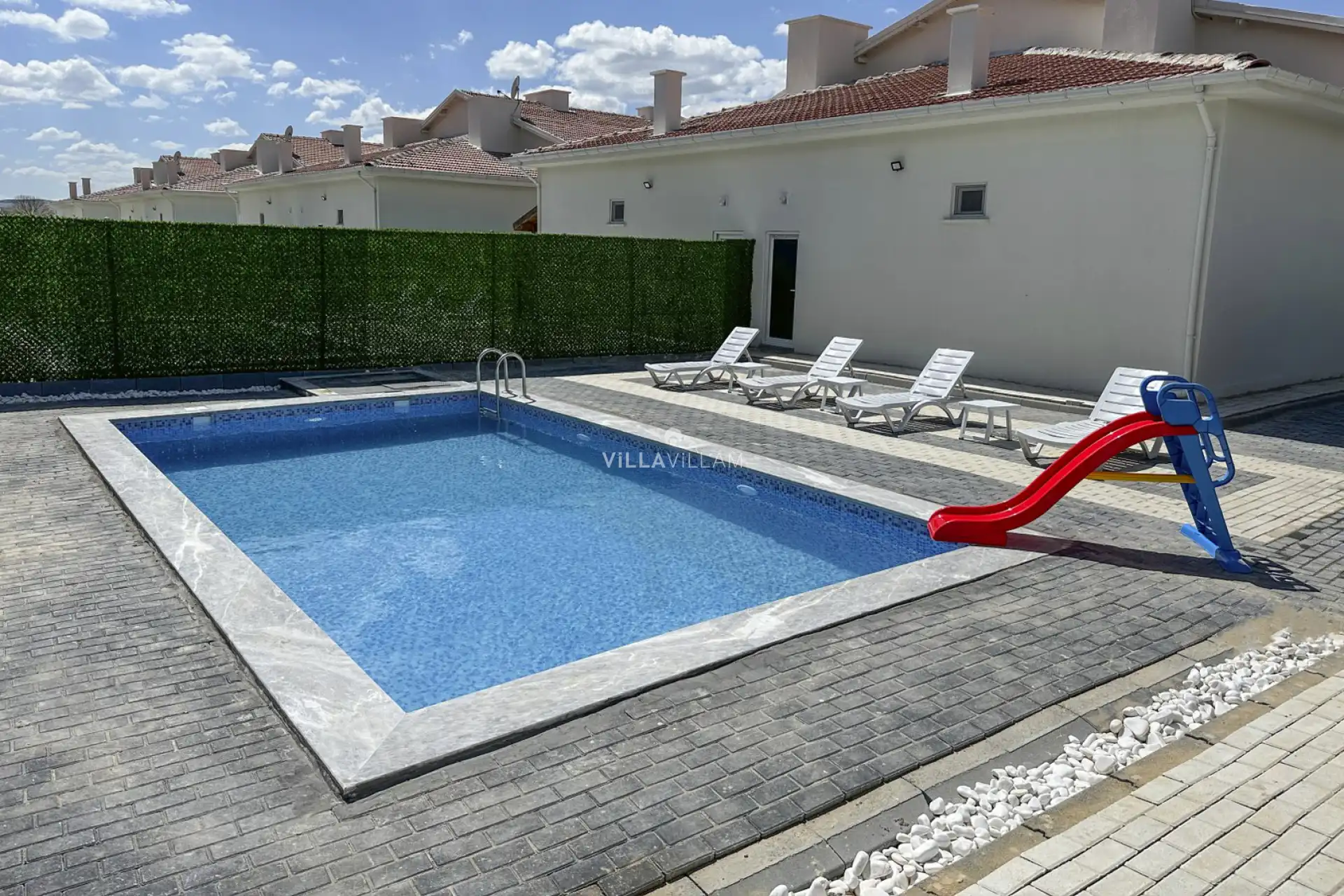 Korunaklı yapıya sahip bahçe ve havuz alanında oturma grubu yer almakta; iç mekânında ise konforlu bir oturma odası ve tam donanımlı bir mutfak bulunmaktadır. Birinci yatak odasında çift kişilik yatak ve ebeveyn banyosu; ikinci yatak odasında iki tek kişilik yatak ve ebeveyn banyosu; üçüncü yatak odasında ise iki tek kişilik yatak yer alırken ayrıca iki adet ortak banyo/wc bulunmaktadır. Kış aylarında konforlu bir konaklama sağlanabilmesi adına villada yerden ısıtma sistemi kullanılmaktadır. Villanın bulunduğu site alanında çocuk oyun alanı, restoran, market, keyifli zaman geçirebileceğiniz kamelyalar ve kamelya önünde süs havuzu yer almaktadır.