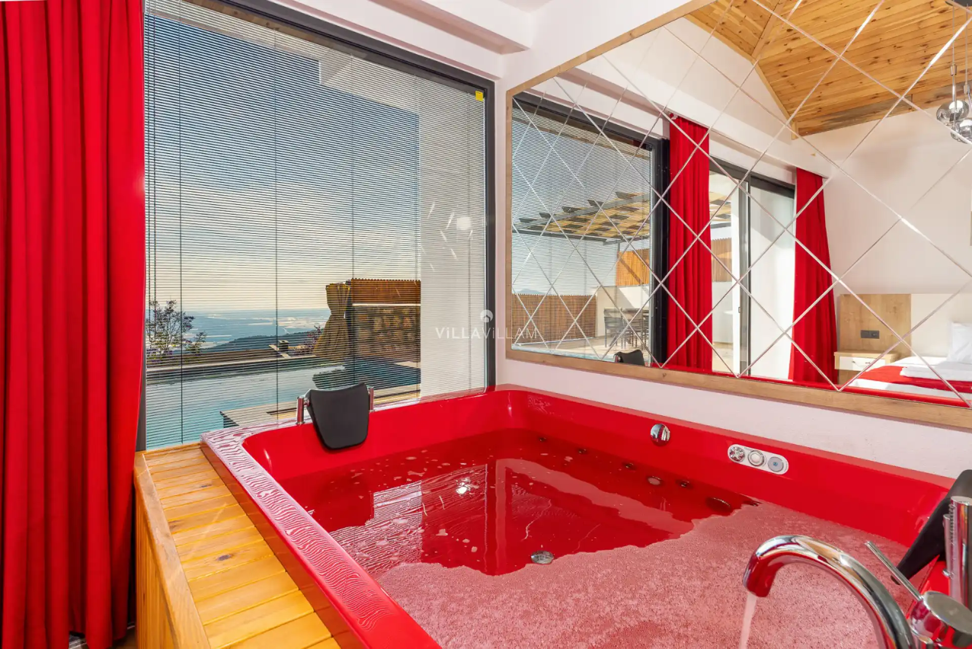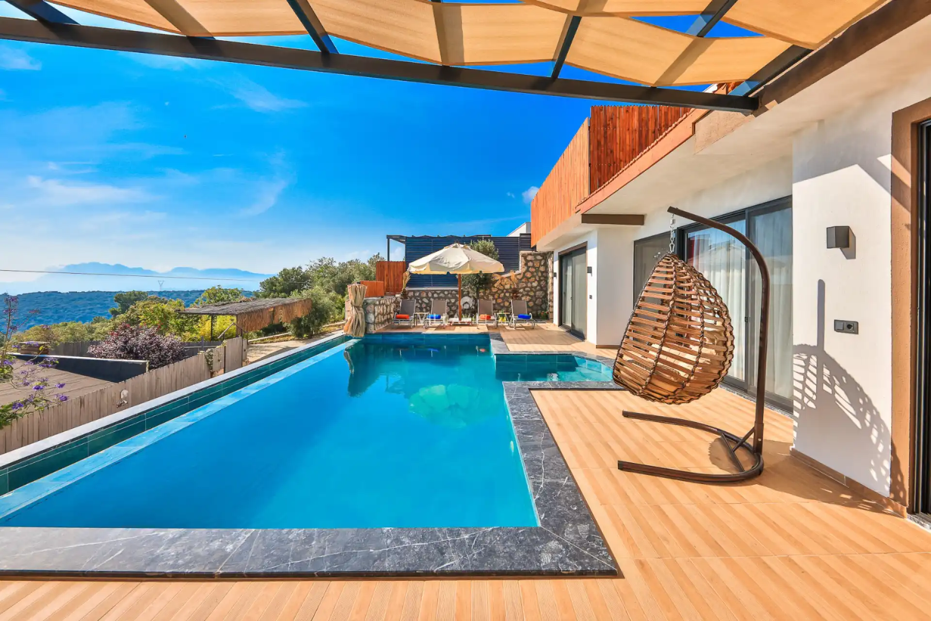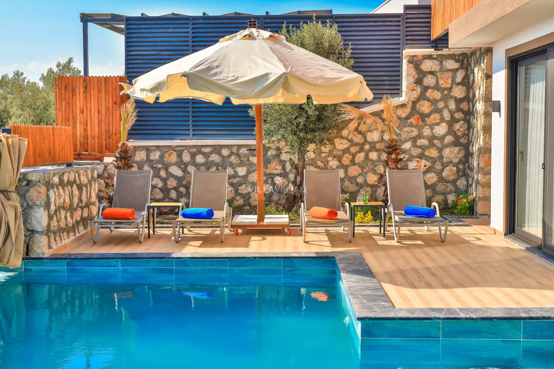 Havuz terasında şezlong takımı, konforlu oturma grubu ve barbekü alanı bulunmaktadır. Konforunuz gözetilerek tasarlanmış olan havuz alanına açılan ferah, şık oturma odası, tam donanımlı açık mutfak; birinci yatak odasında çift kişilik yatak, jakuzi ve ebeveyn banyosu; ikinci yatak odasında çift kişilik yatak ve ebeveyn banyosu bulunmaktadır.