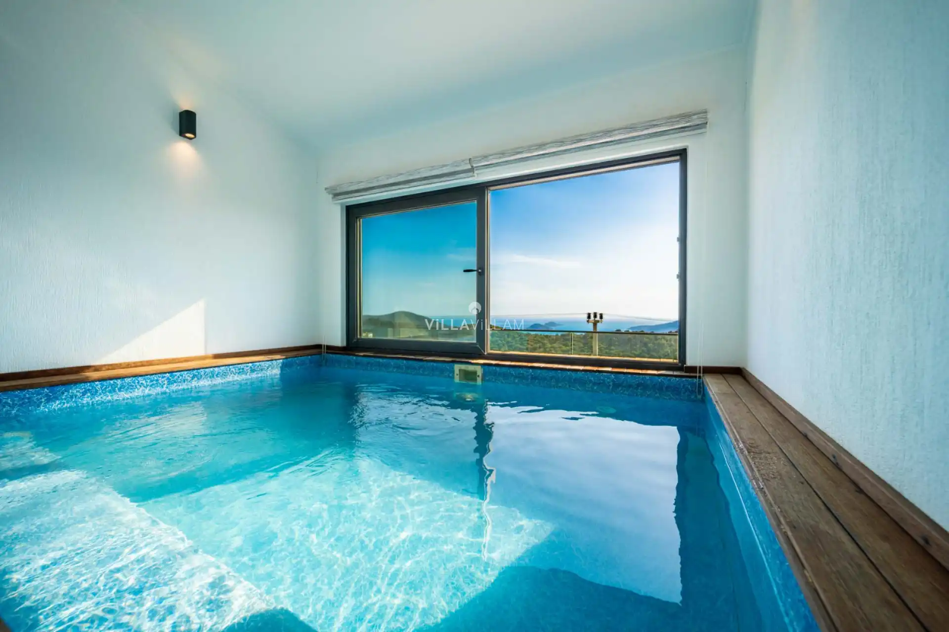 Havuz terasında kapasiteye uygun şezlong takımı, oturma grubu ve barbekü alanı bulunan villa, konforlu bir tatil imkânı sunmaktadır. Yine havuz terasına açılan konforlu oturma odası ve tam donanımlı açık mutfağı; iki yatak odasında çift kişilik yatak ve ebeveyn banyosu; üçüncü yatak odasında ise iki tek kişilik yatak ve ebeveyn banyosu bulunmaktadır. Oda teraslarından Kalkan manzarasına hâkim olabileceğiniz, ısıtmalı kapalı havuzunda keyif yapabileceğiniz ayrıcalıklı bir tatilin keyfini sürebileceksiniz.