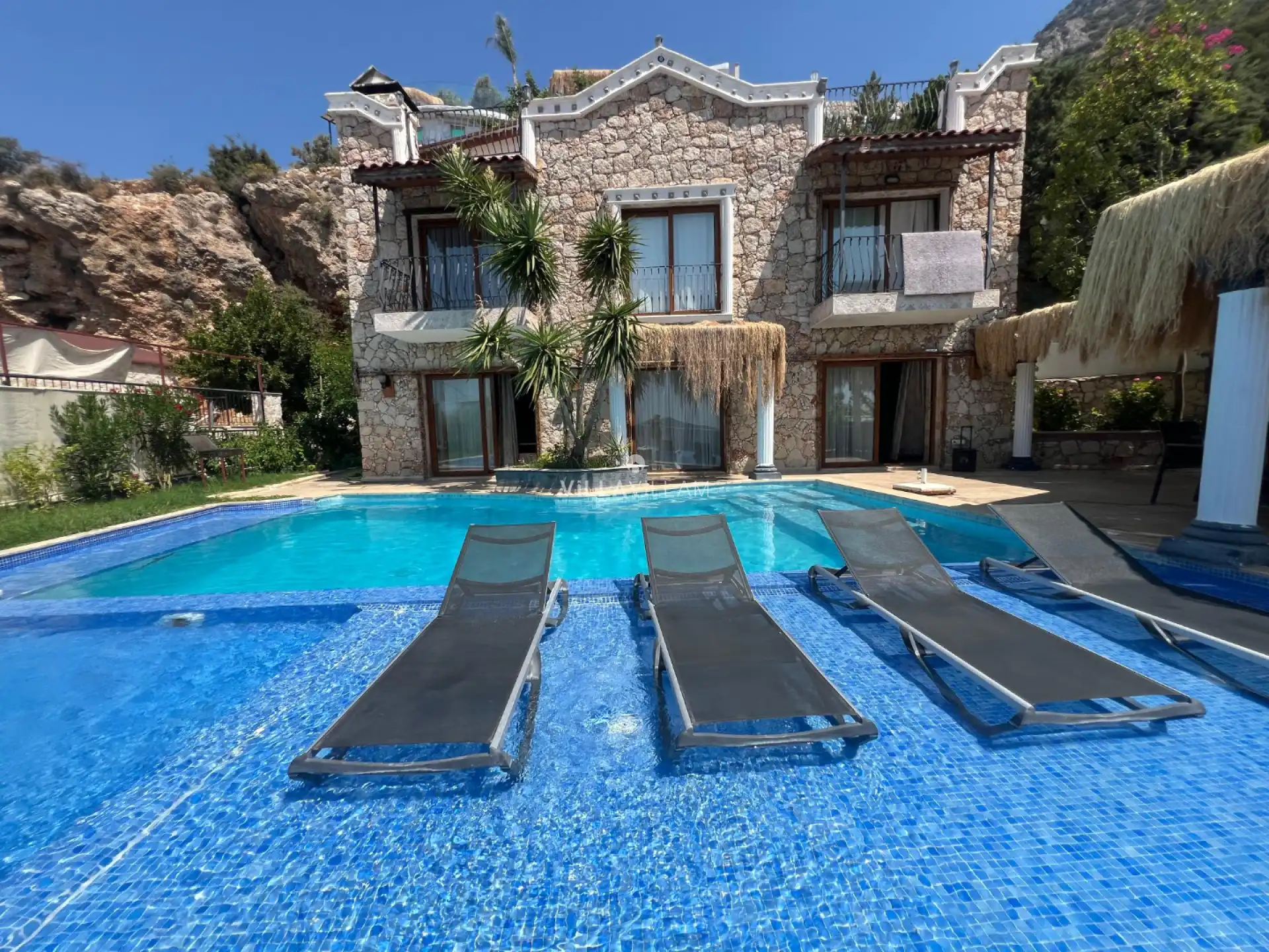 Kalkan Akbel bölgesinde yer alan villa, 4 yatak odasıyla 8 kişilik konaklama kapasitesi sunmaktadır. Korunaklı havuz alanına sahip villamız deniz manzaralı ve jakuzili özelliği ile kalabalık aile ve arkadaş grupları için idealdir.