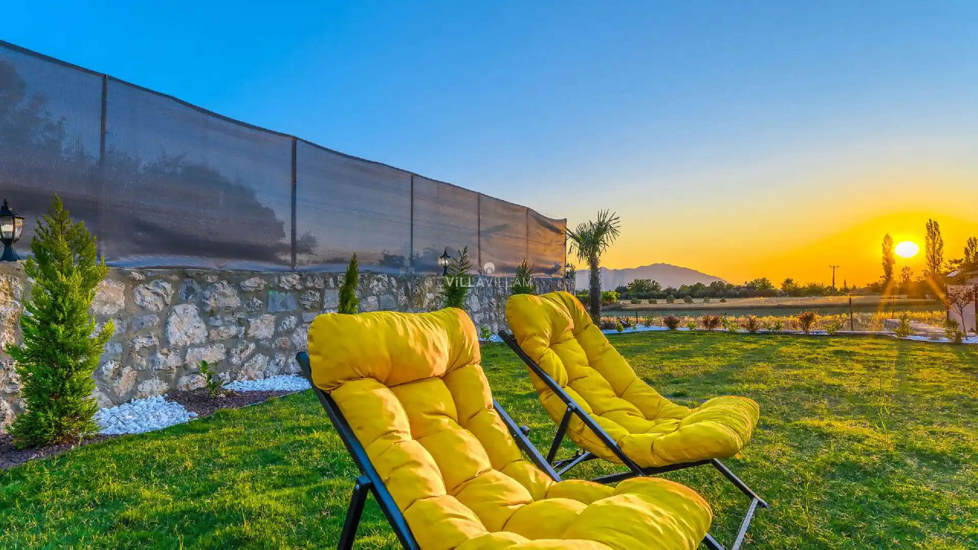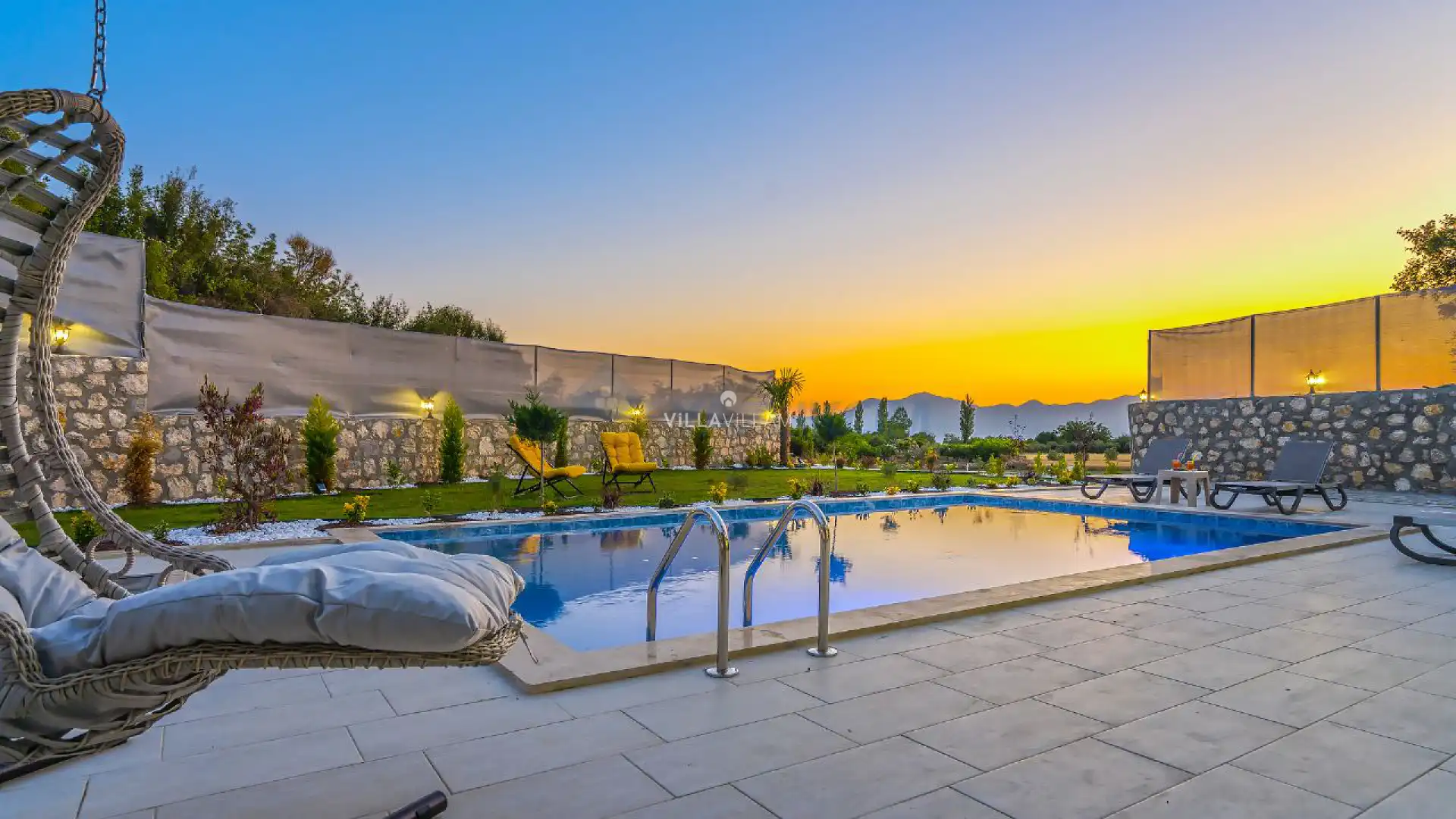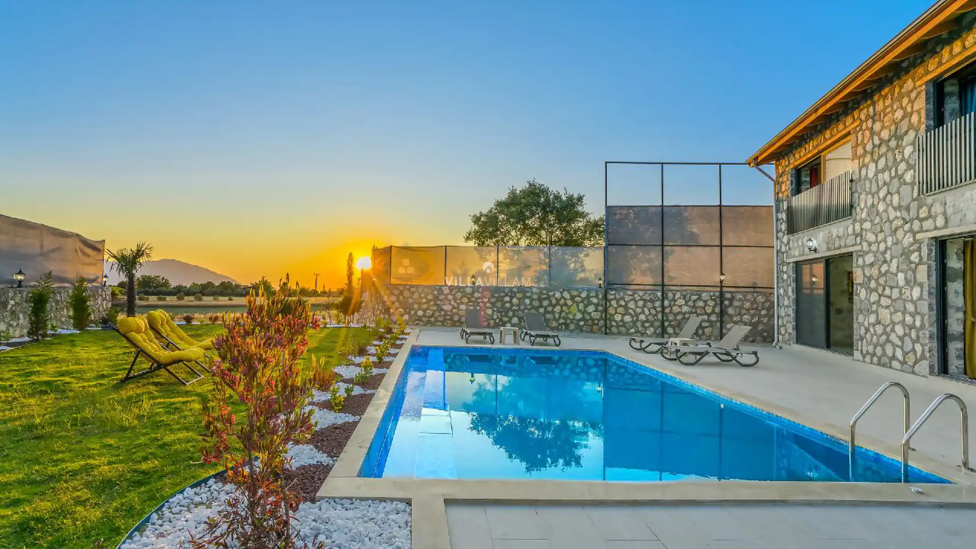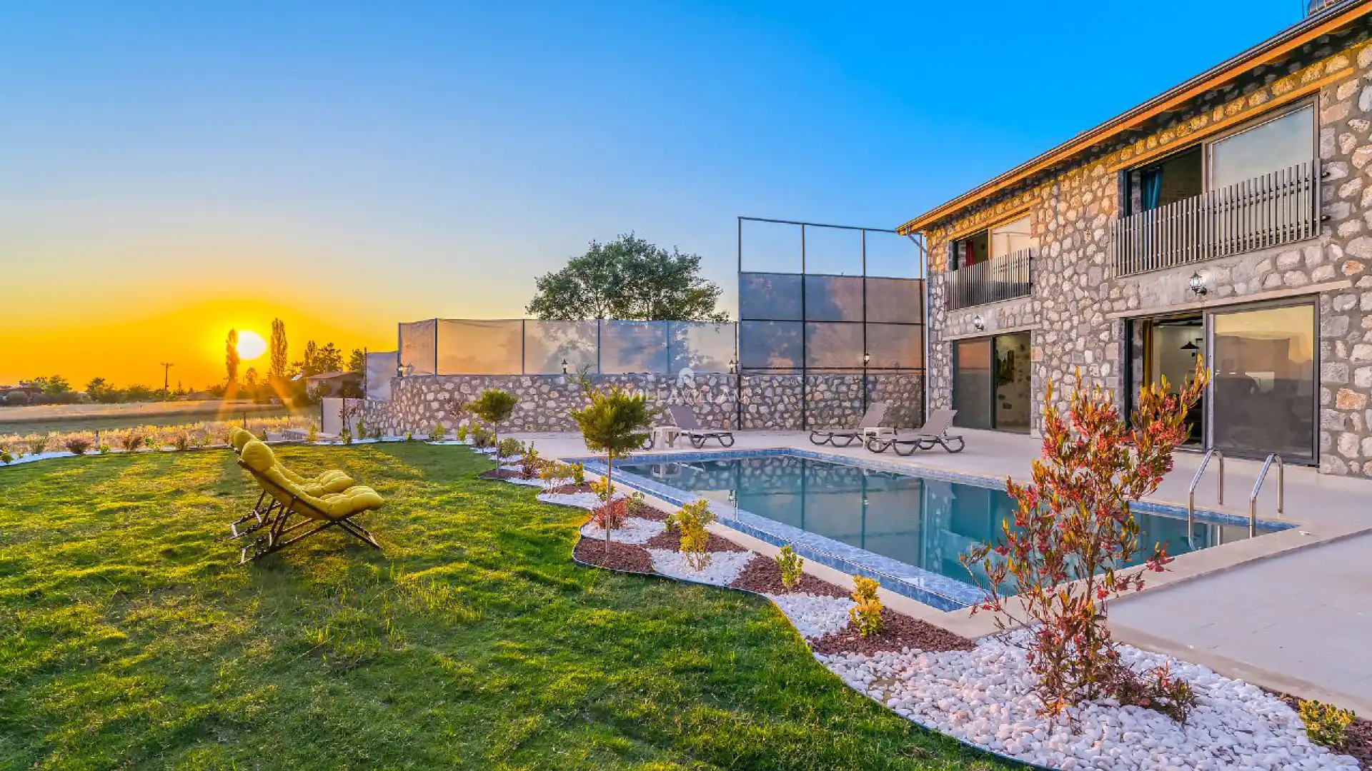 Geniş bahçe alanında oturma grubu, şezlong takımı, salıncak ve barbekü alanı yer almaktadır. İç mekanda ise havuz terasına açılan konforlu oturma odası, ihtiyaçlarınızı karşılayacak tam donanımlı mutfağı bulunmaktadır. Birinci yatak odasında da çift kişilik yatak, jakuzi ve ebeveyn banyosu; ikinci yatak odasında iki tek kişilik yatak ve ebeveyn banyosu bulunmaktadır.