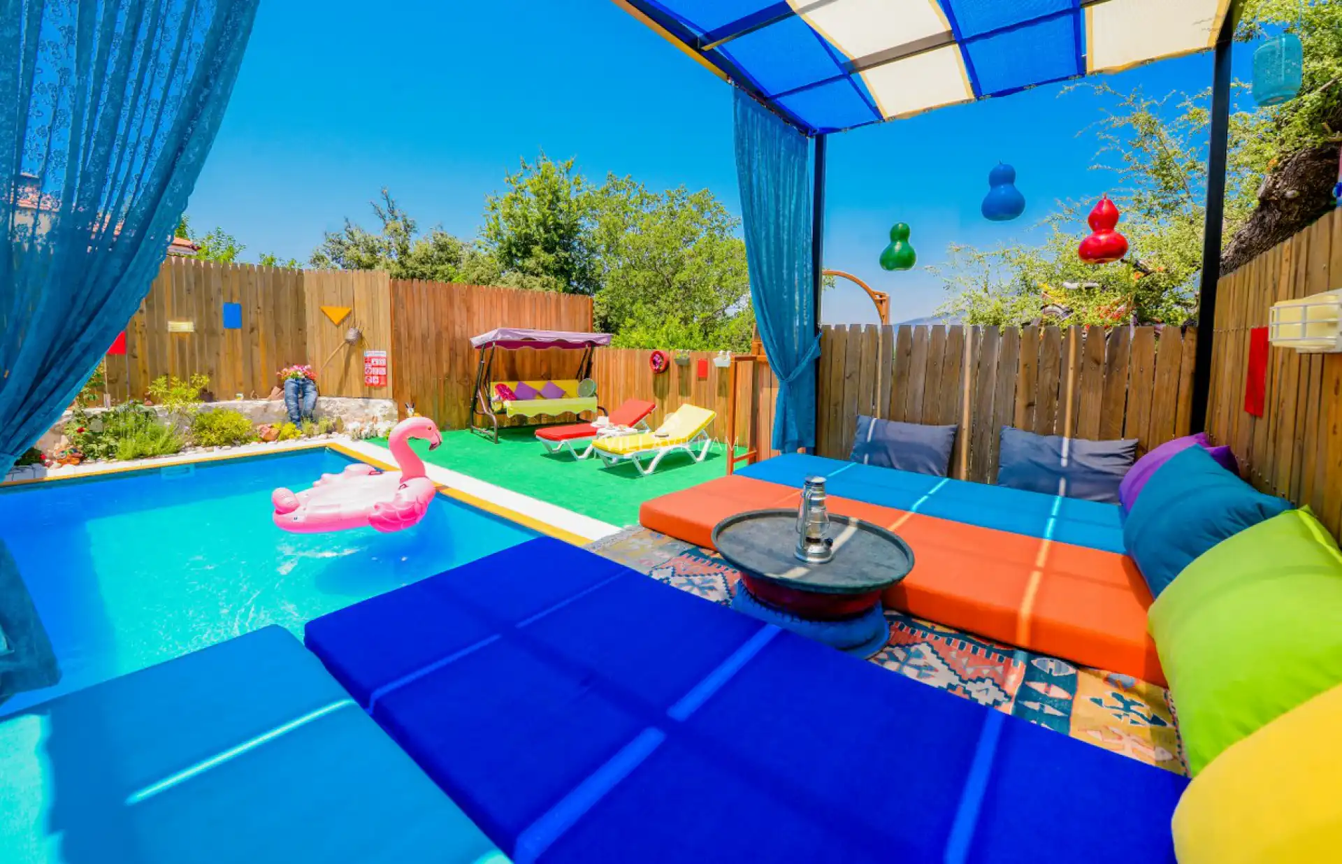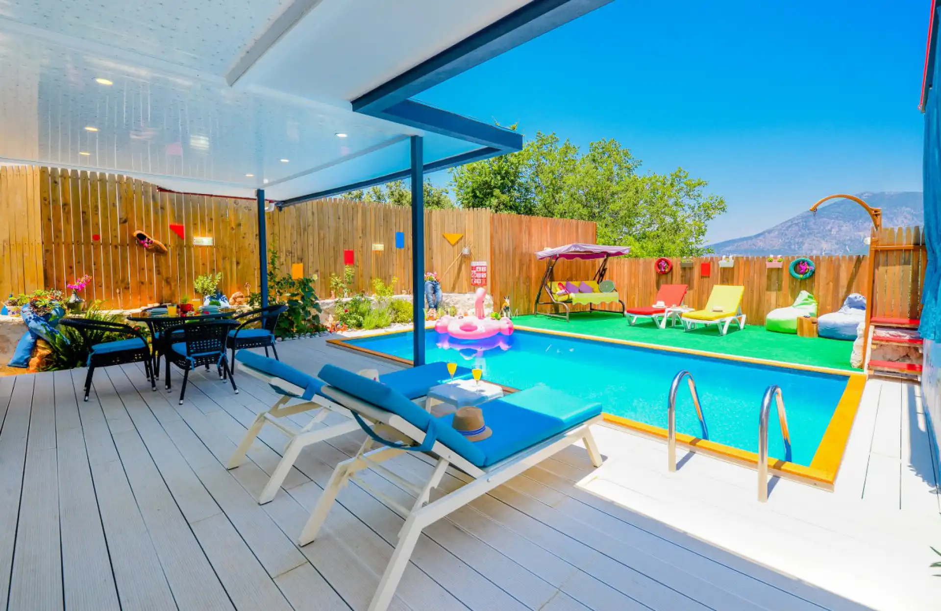 Kalkan Üzümlü bölgesinde bulunan villa, 1 yatak odalı 2 kişilik konaklama kapasitesi sunmaktadır. Korunaklı havuz alanına sahip olan villa, balayı çiftleri ve çekirdek aileler için uygundur.