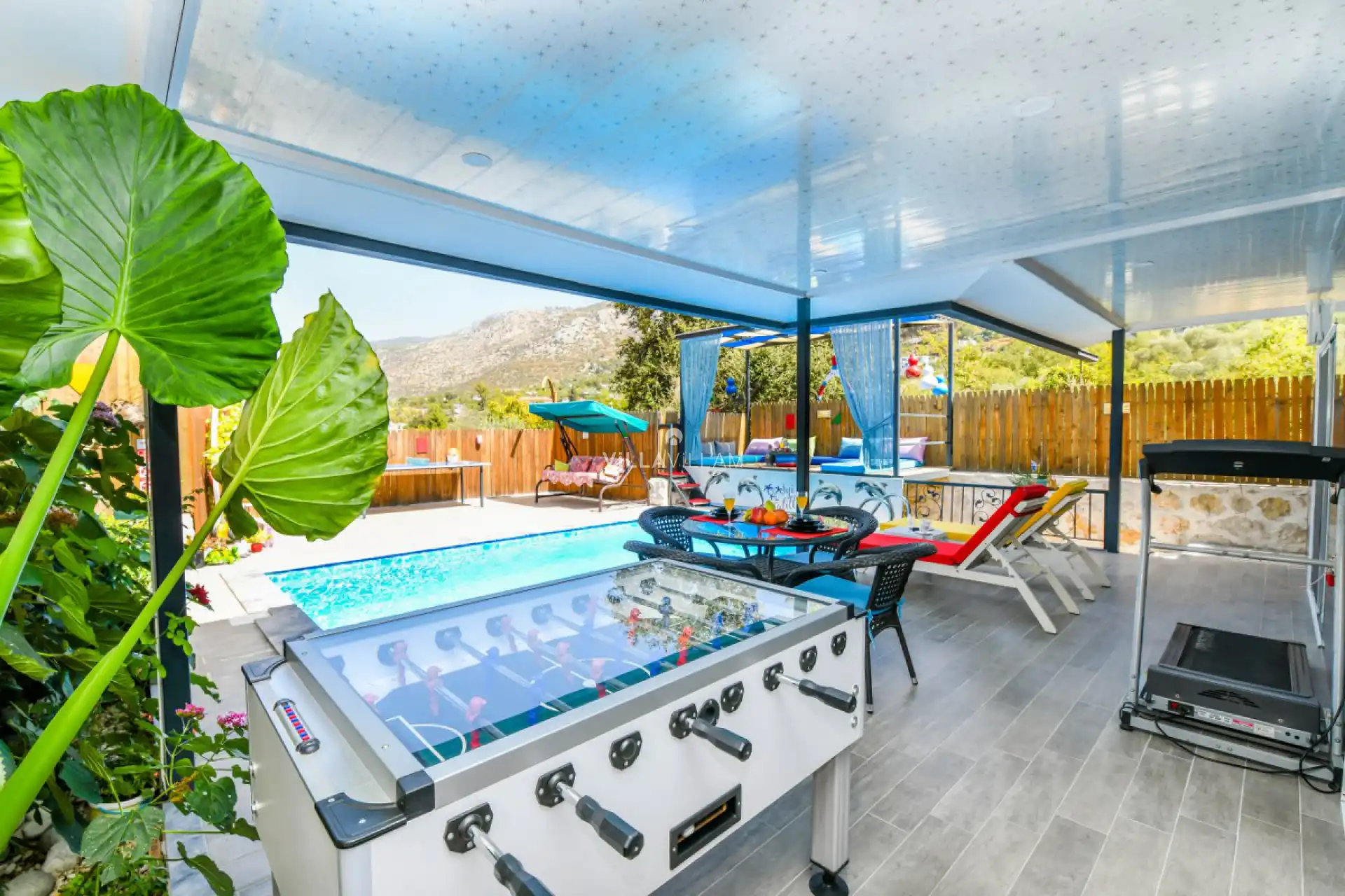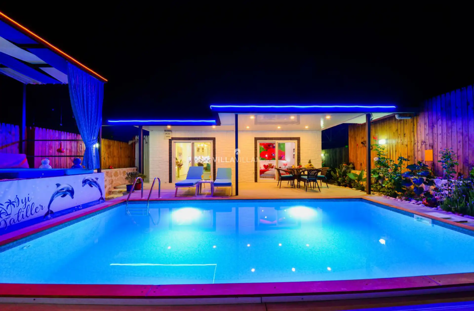Doğa içindeki konumundan esinlenerek dizayn edilmiş bahçe alanı geniş havuz terasında sahiptir ve havuz bahçe alanında kapasiteye uygun şezlong takımı, konforlu oturma grubu, salıncak, masa tenisi, langırt ve barbekü bulunmaktadır. Konforunuz gözetilerek şık ve korunaklı tasarlanmış olan muhafazakar havuz alanına açılan ferah oturma odası, tam donanımlı açık mutfak; yatak odası bulunmaktadır. Yatak odasında çift kişilik yatak, jakuzi ve ebeveyn banyosu mevcut olan villa, ihtiyaçlarınıza tam karşılık verecek donanıma sahiptir.