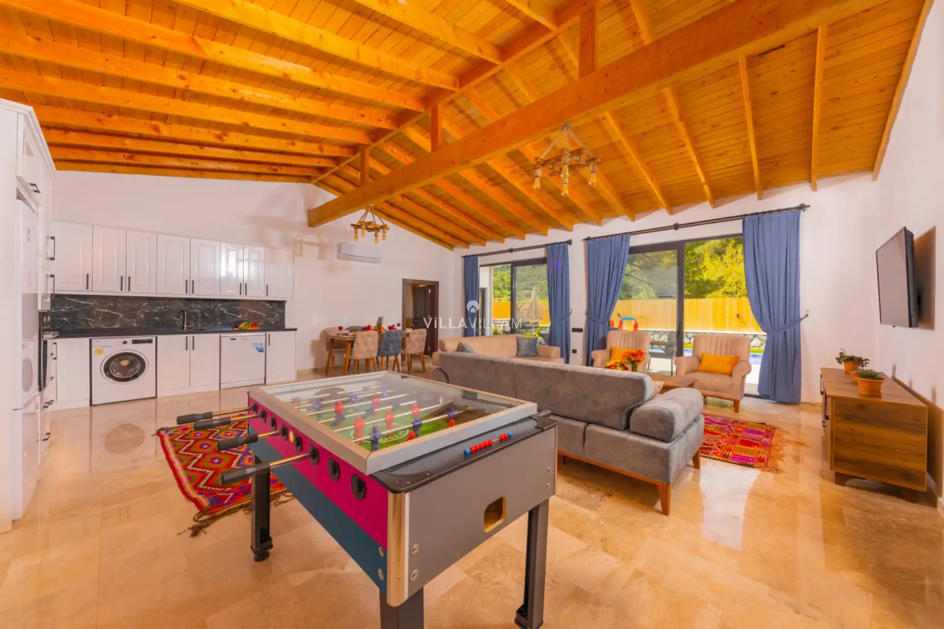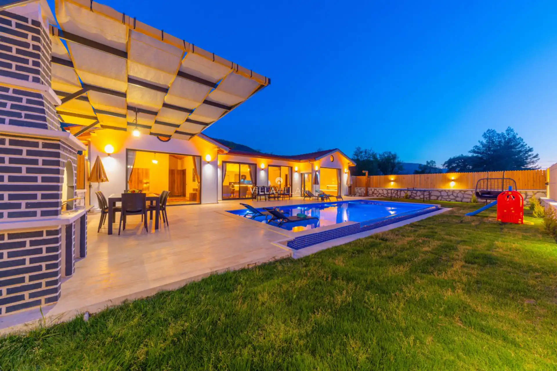 Doğa içinde korunaklı havuz ve bahçe alanına sahip villanın konaklama kapasitesine uygun oturma alanı, şezlong takımı, masa tenisi, barbekü ve çocuk oyun alanı; konforlu oturma odası, ihtiyaçlarınızı karşılayacak donanımlı mutfağı bulunmaktadır. Birinci yatak odasında bir çift kişilik yatak, ebeveyn banyosu ve jakuzi; ikinci odada da bir tek kişilik ve bir çift kişilik yatak, ebeveyn banyosu bulunmaktadır.