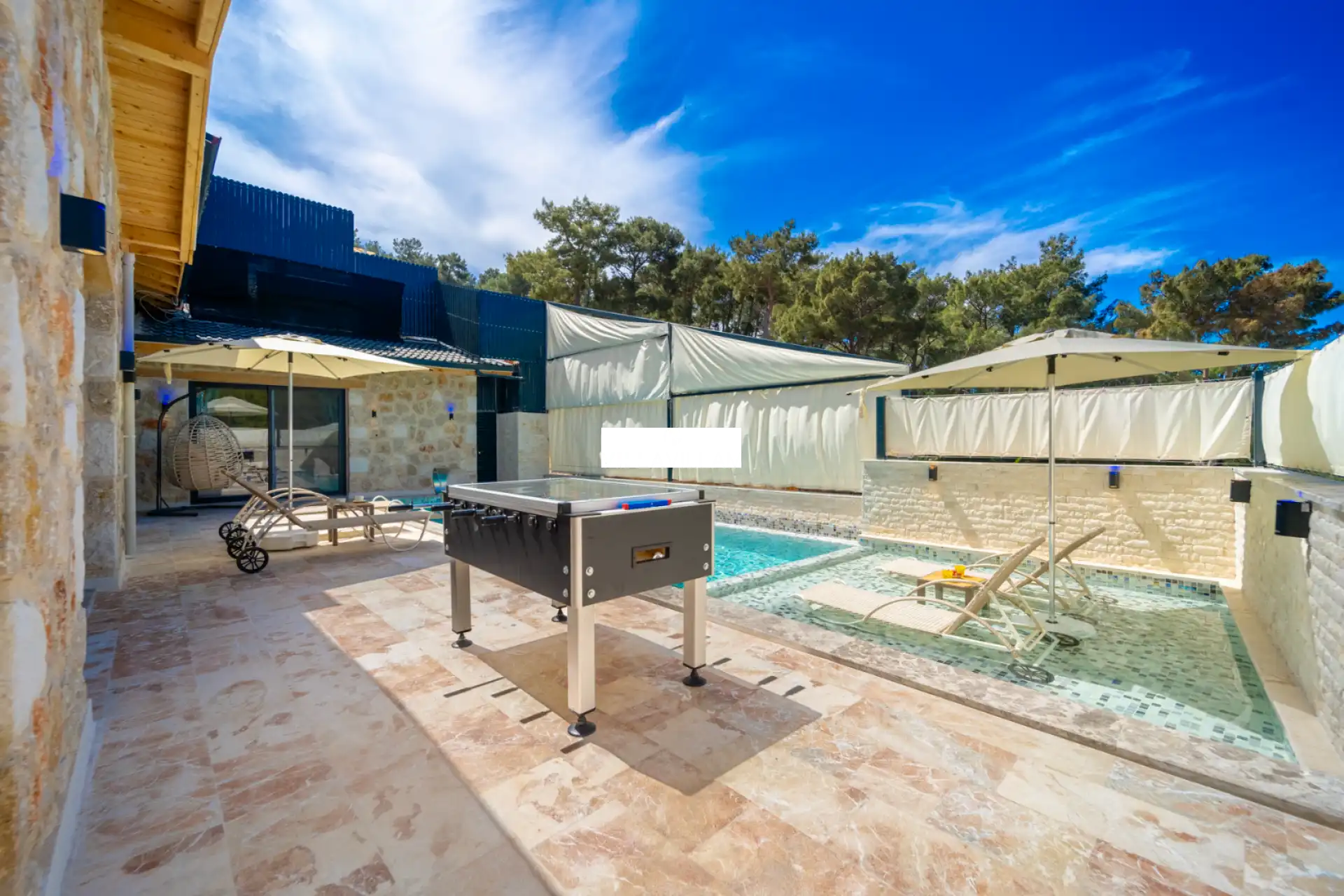 Temiz havanın ve güneşin hiç eksilmediği havuz alanında bitmesini istemeyeceğiniz bir tatil sizleri bekliyor. Şehirden uzak, sakin bir tatil arayan misafirlerimizin tam olarak aradığını bulacağı kriterlere ve olanaklara sahip villamız; doğayla iç içe konumu, tatilinize renk katacak havuz terasında kapasiteye uygun şezlong takımı, salıncak, oturma grubu ve barbekü alanı ile keyifli bir alana sahiptir. Geniş havuz alanına açılan konforlu oturma odası ve tam donanımlı açık mutfağı; birinci yatak odasında çift kişilik yatak, ebeveyn banyosu ve jakuzi; ikinci yatak odasında ise iki tek kişilik yatak ve banyo bulunmaktadır.