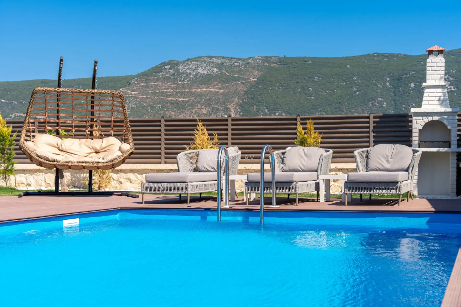 Not: Bölgede aynı özelliklere sahip toplam 2 villa bulunmaktadır. Her villa özel havuzlu olarak hizmet vermektedir. Aynı iç ve dış dekorasyona sahip 2 villamız için ortak görseller kullanılmıştır. Aynı zamanda ortak alanlarda barbekü alanı, voleybol sahası ve çocuklar için oyun alanı mevcuttur.