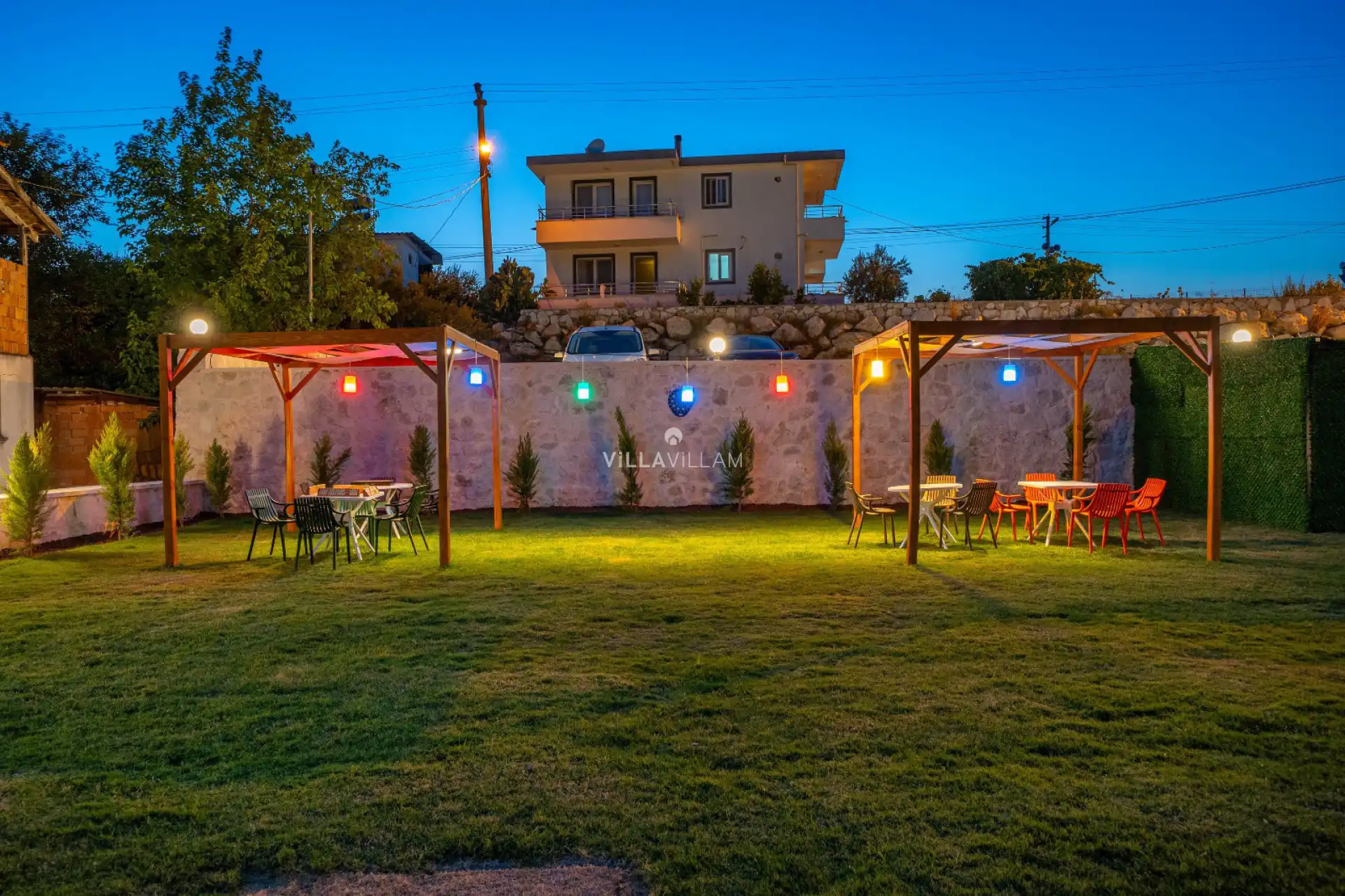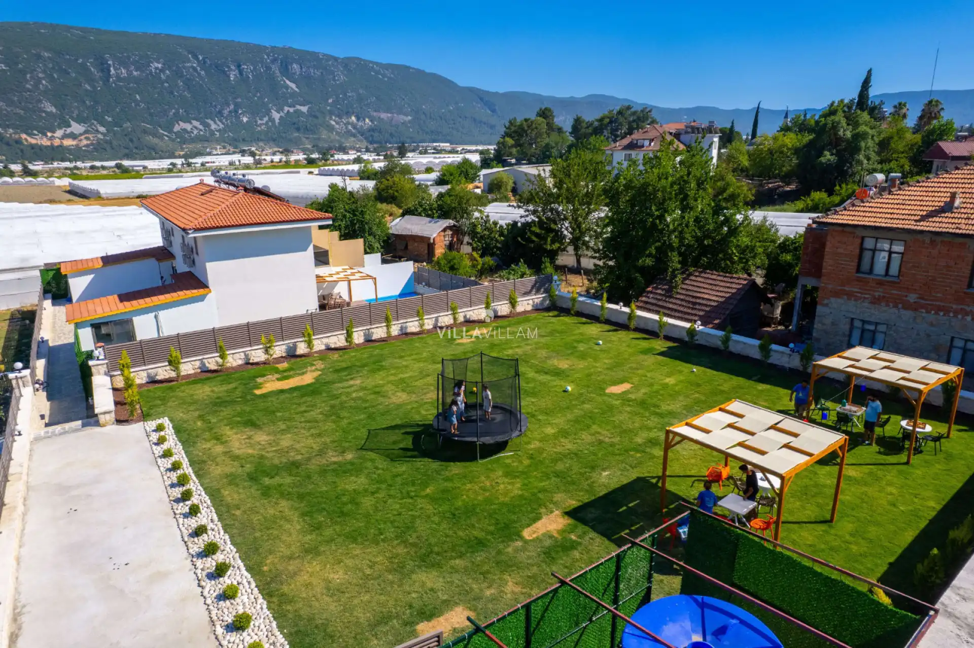 Not: Bölgede aynı özelliklere sahip toplam 2 villa bulunmaktadır. Her villa özel havuzlu olarak hizmet vermektedir. Aynı iç ve dış dekorasyona sahip 2 villamız için ortak görseller kullanılmıştır. Aynı zamanda ortak alanlarda barbekü alanı, voleybol sahası ve çocuklar için oyun alanı mevcuttur.