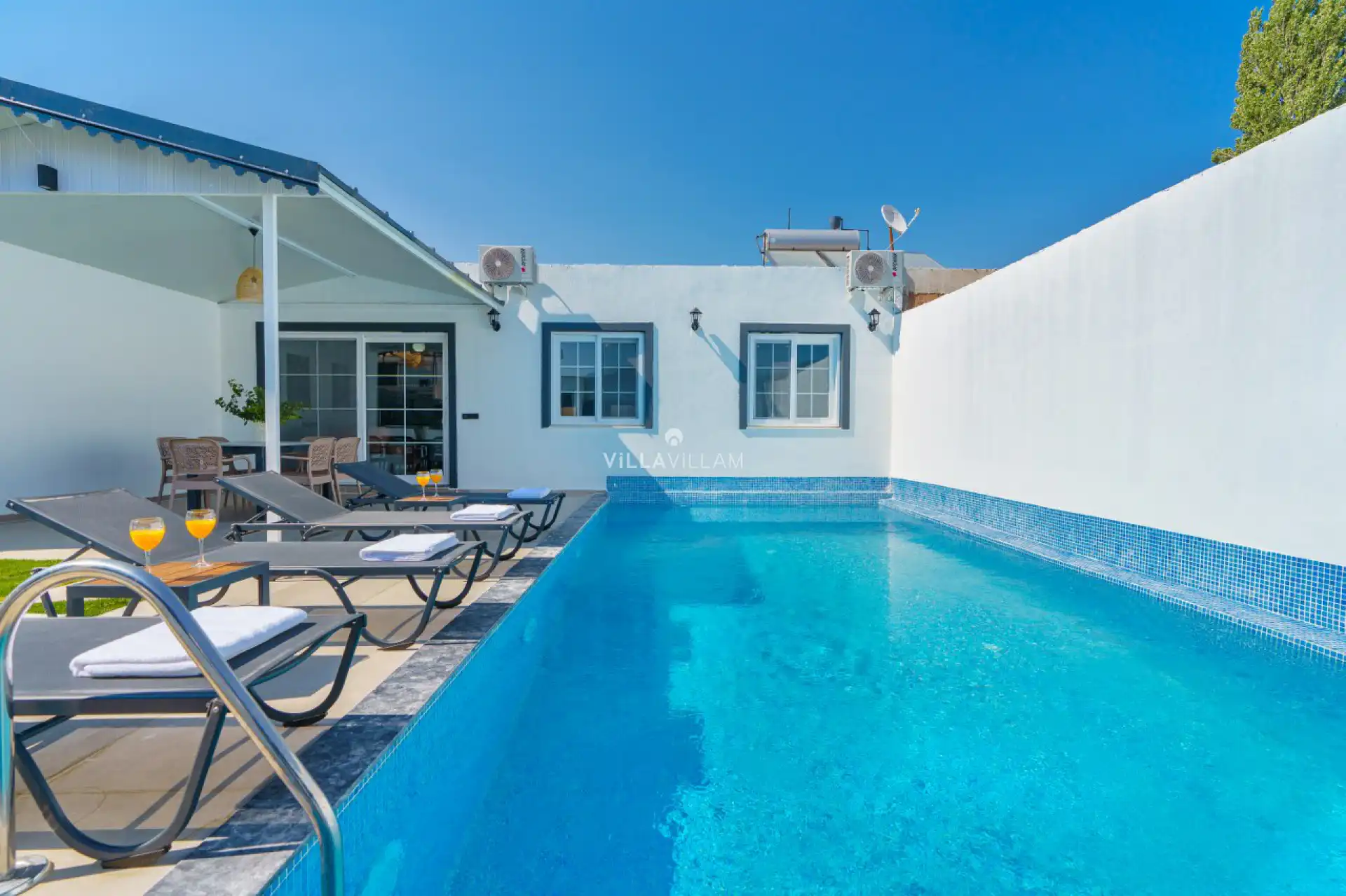 Sevdiklerinizle birlikte güneşin tadını çıkarabileceğiniz havuz ve bahçe alanında, kapasiteye uygun şezlong takımı ve oturma grubu yer almaktadır. İç mekânda ise havuz terasına açılan konforlu oturma odası, donanımlı açık mutfak; birinci yatak odasında çift kişilik yatak ve ebeveyn banyosu; ikinci yatak odasında iki tek kişilik yatak bulunmaktadır.
