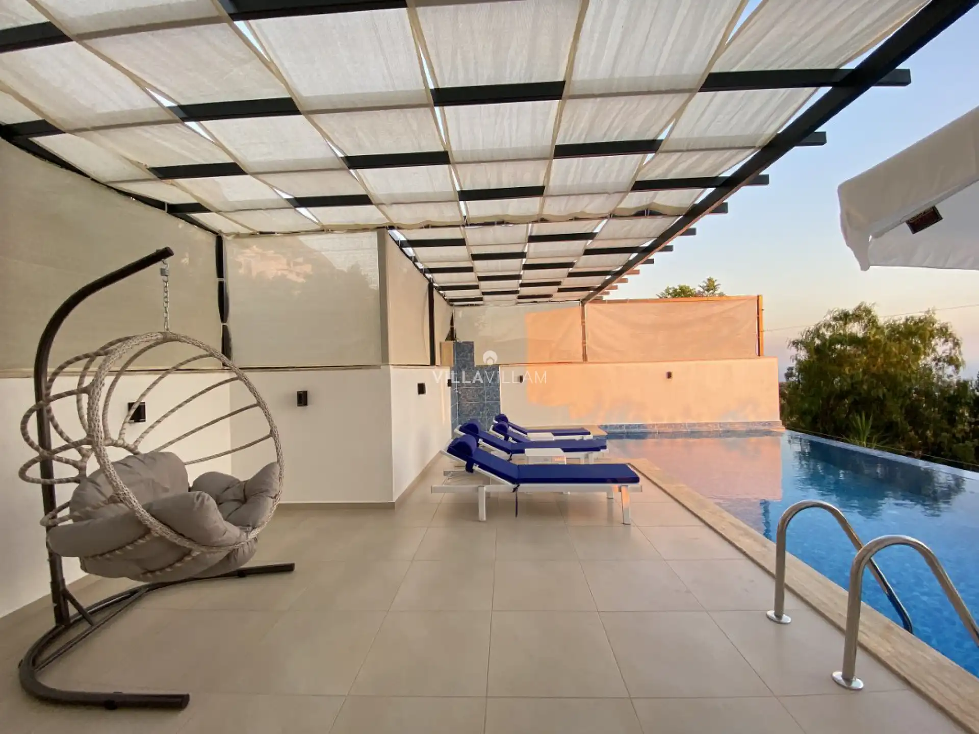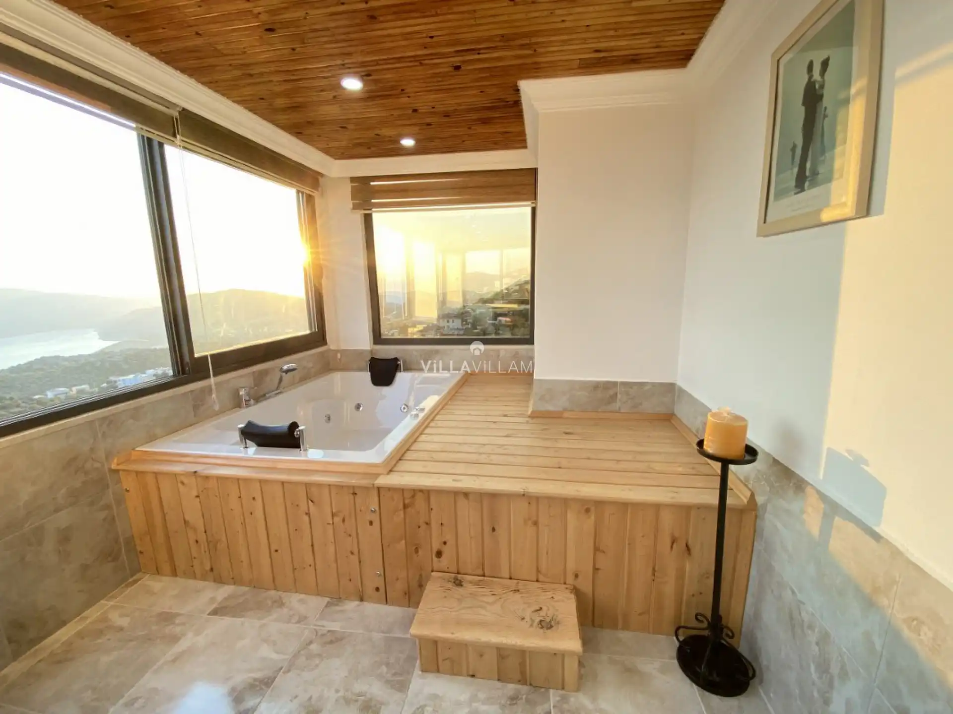 Şık dizaynıyla göz dolduran villanın havuz terasında kapasiteye uygun şezlong takımı, oturma grubu, barbekü bulunan villanın iç mekanında ihtiyaçlarınıza karşılık verecek konforlu oturma odası, tam donanımlı açık mutfağı; bir yatak odasında çift kişilik yatak, ebeveyn banyosu ve jakuzi; ikinci yatak odasında iki tek kişilik yatak bulunmaktadır. Yine alt katta ortak kullanım banyo yer almaktadır. Deniz manzarasıyla güne başlarken, tatilinizin her anını keyifle yaşayabileceksiniz.