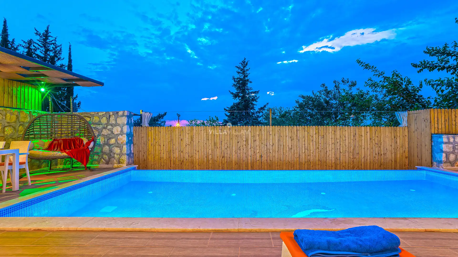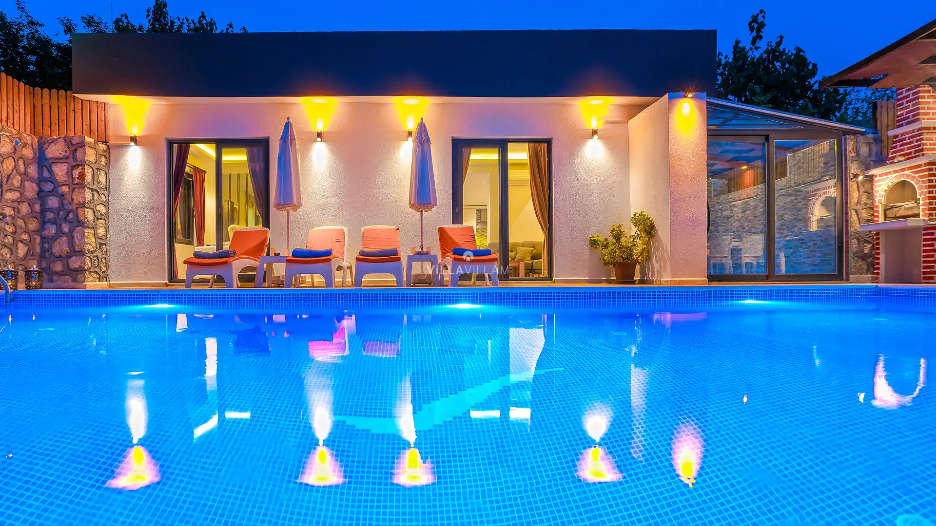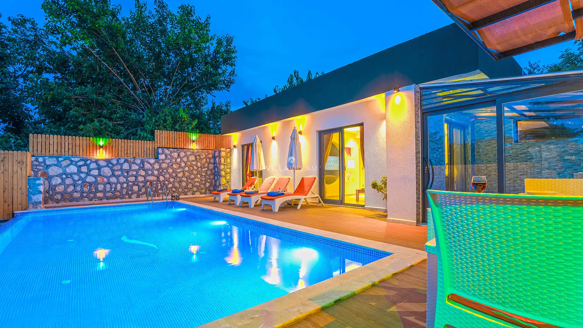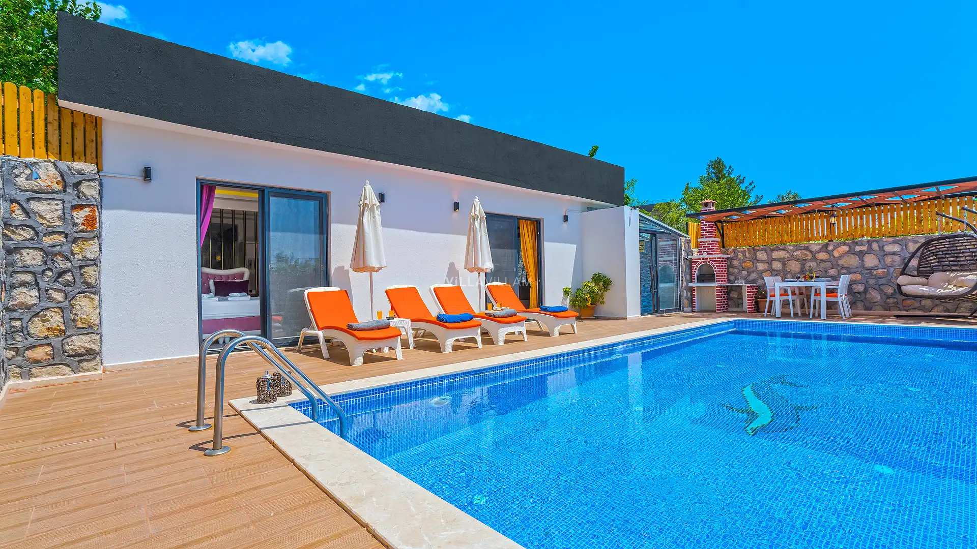 Kalkan Üzümlü bölgesinde bulunan villa, 2 yatak odasıyla 4 kişilik konaklama kapasitesi sunmaktadır. Korunaklı havuz alanına hakim, donanımlılığıyla göz dolduran villa balayı ve arkadaş grupları için ideal seçenekler arasındadır.